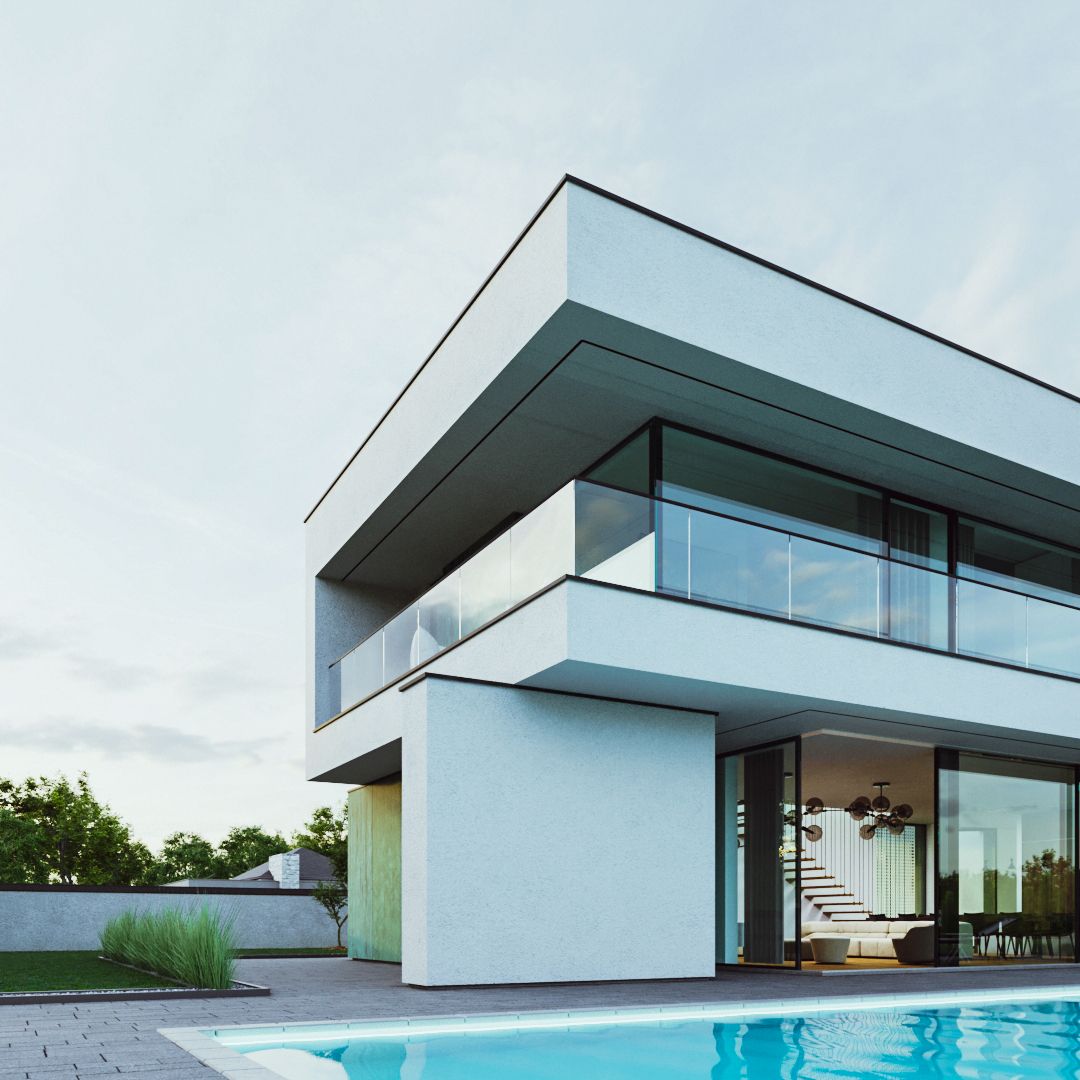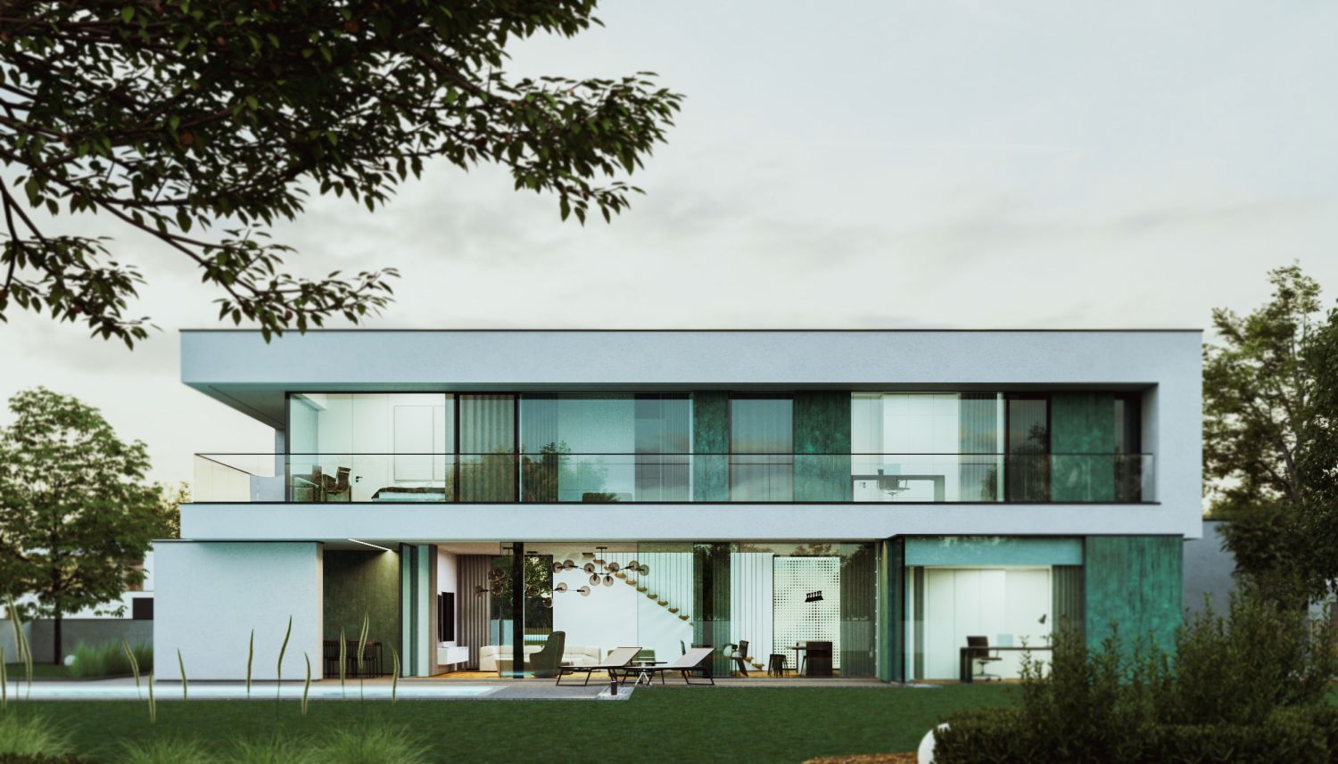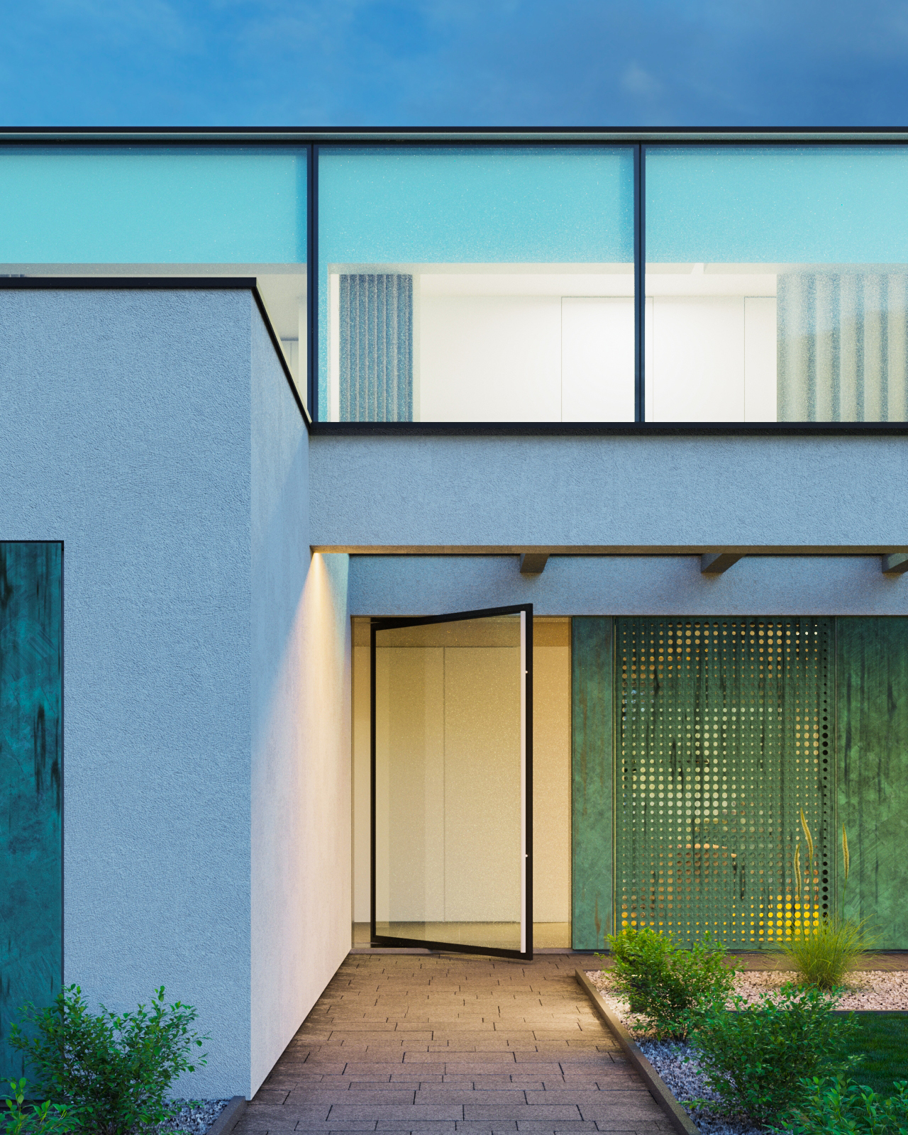 Dom składa się z kilku brył skomponowanych w taki sposób, aby oddzielać strefę dzienną od strefy nocnej. W parterze na elewacjach zastosowano patynę, charakteryzująca się turkusowym odcieniem z licznymi przetarciami. Salon, kuchnia oraz biuro ma bezpośredni widok na dużą przestrzeń ogrodu. Zlokalizowana na piętrze strefa nocna, dzięki wysokim przeszkleniom rozciągniętym na prawie całą szerokość elewacji, ma widok 360 stopni na działkę.
