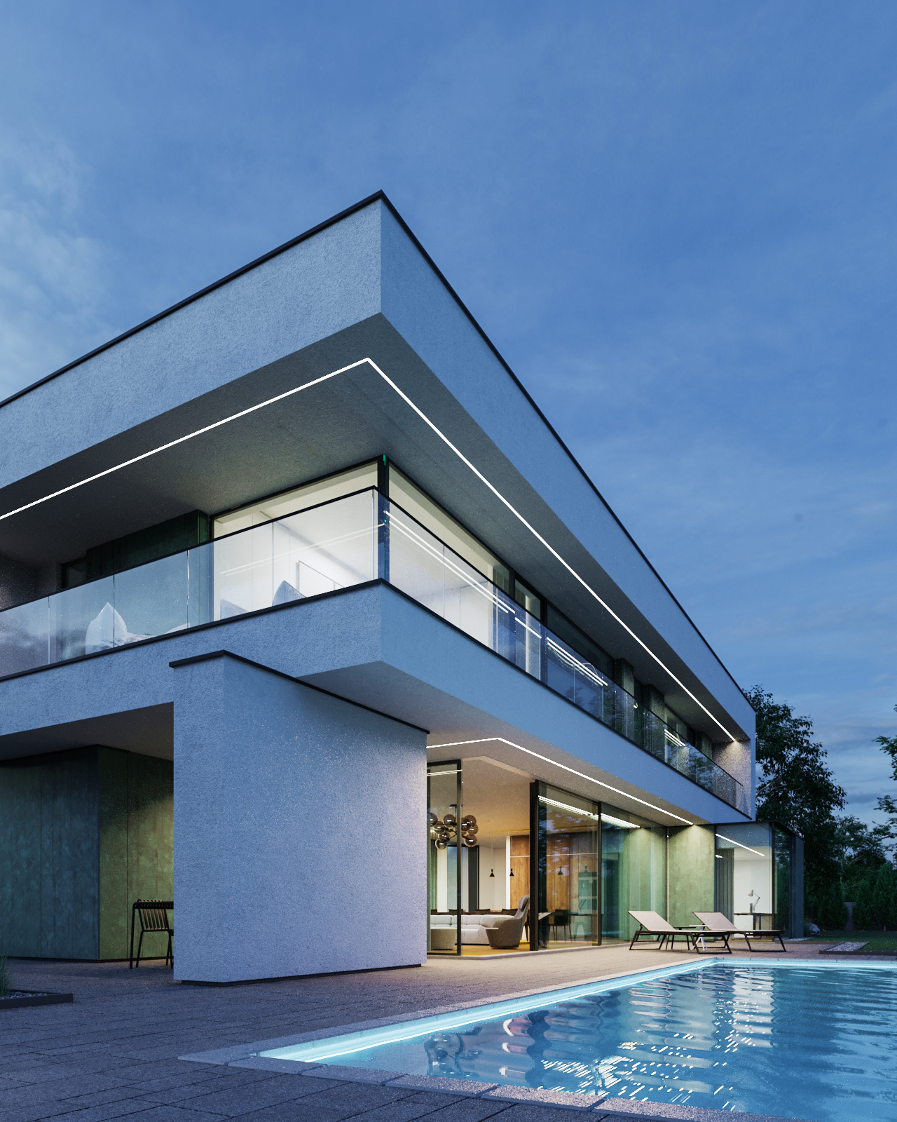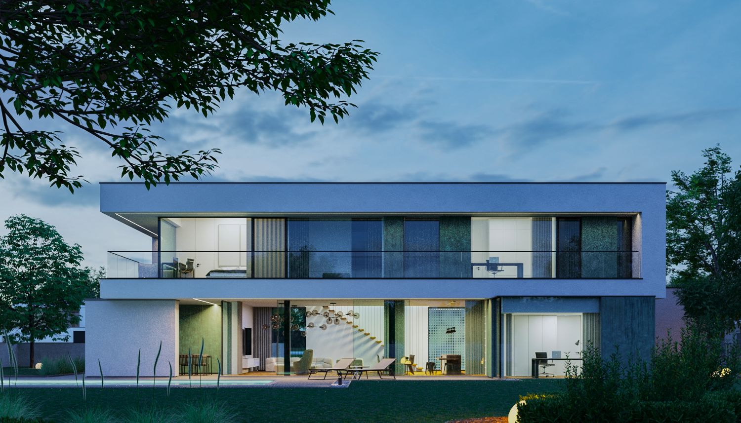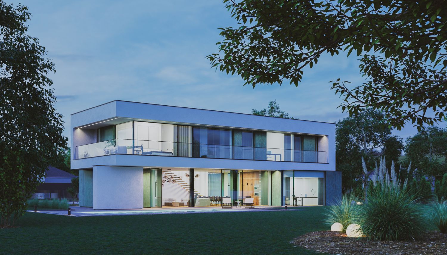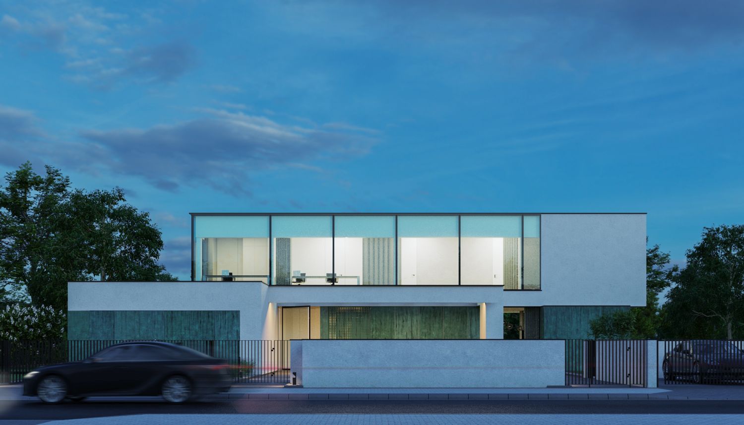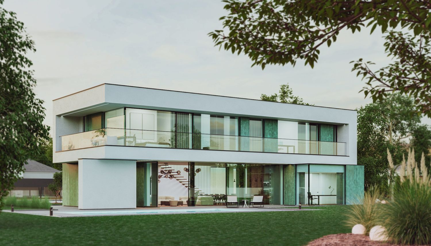The house consists of several blocks composed in such a way as to separate the day zone from the night zone. On the ground floor, patina metal sheets were used on the facades, characterized by a turquoise shade with numerous abrasions. The living room, kitchen and private office have a direct view of the large garden space. The night zone, located on the first floor, has a 360-degree view of the plot thanks to high glazing stretching almost the entire width of the façade.