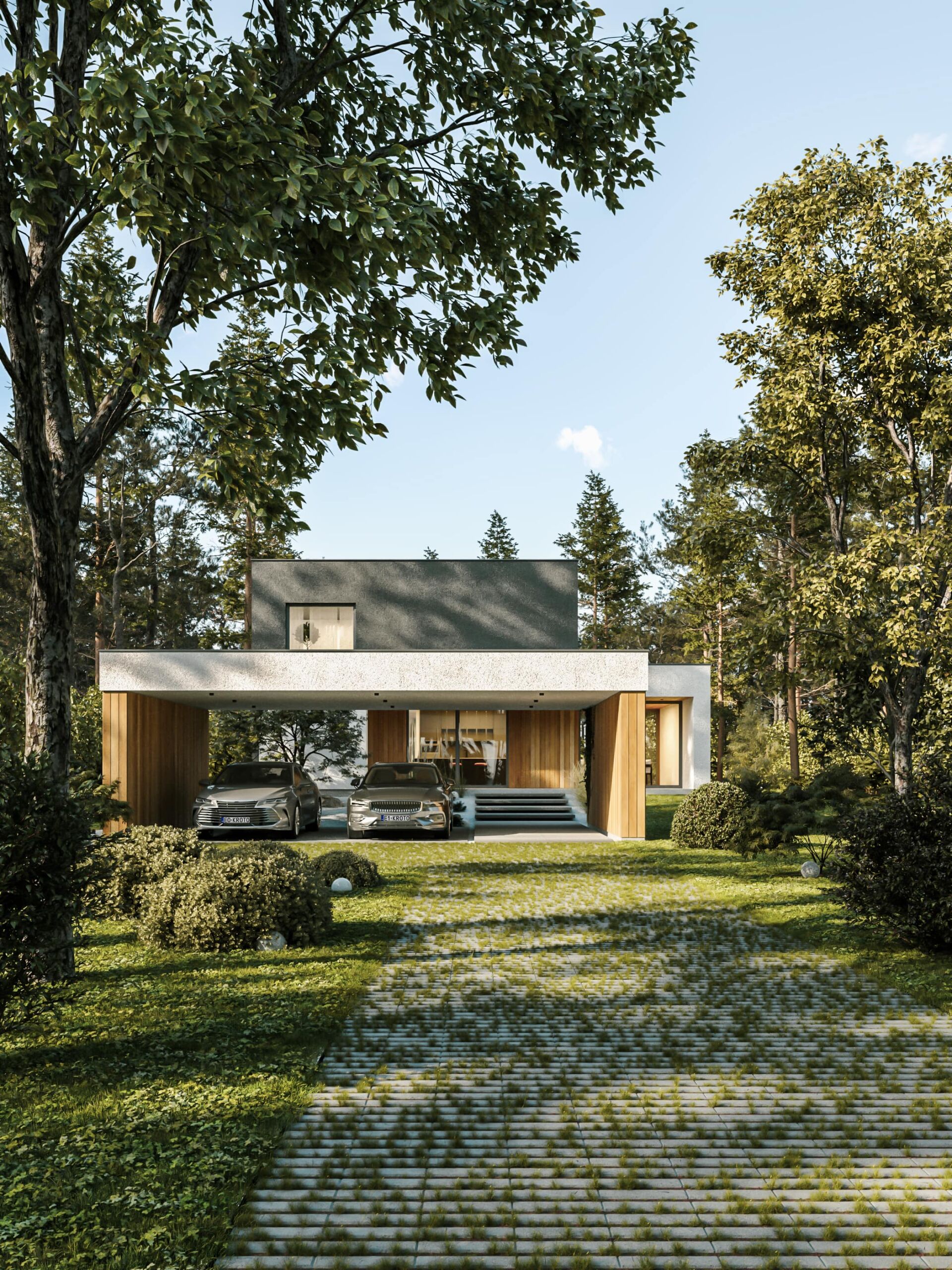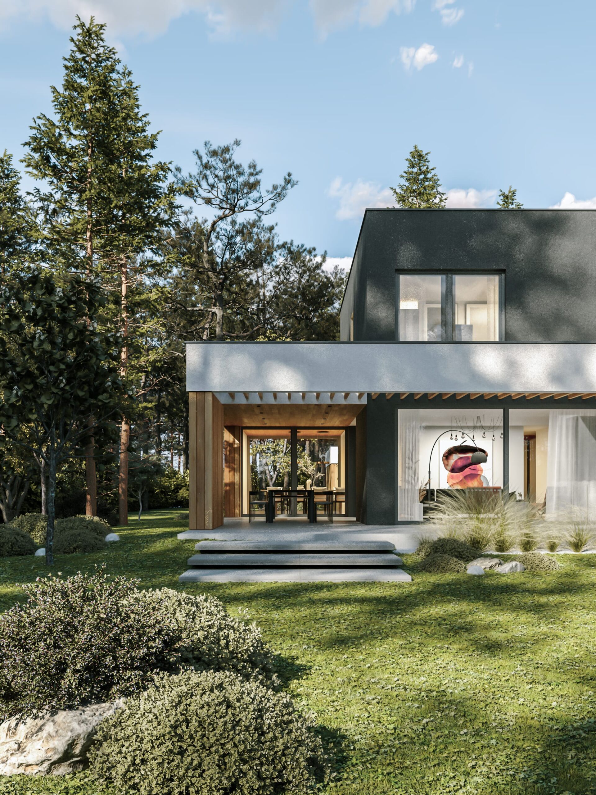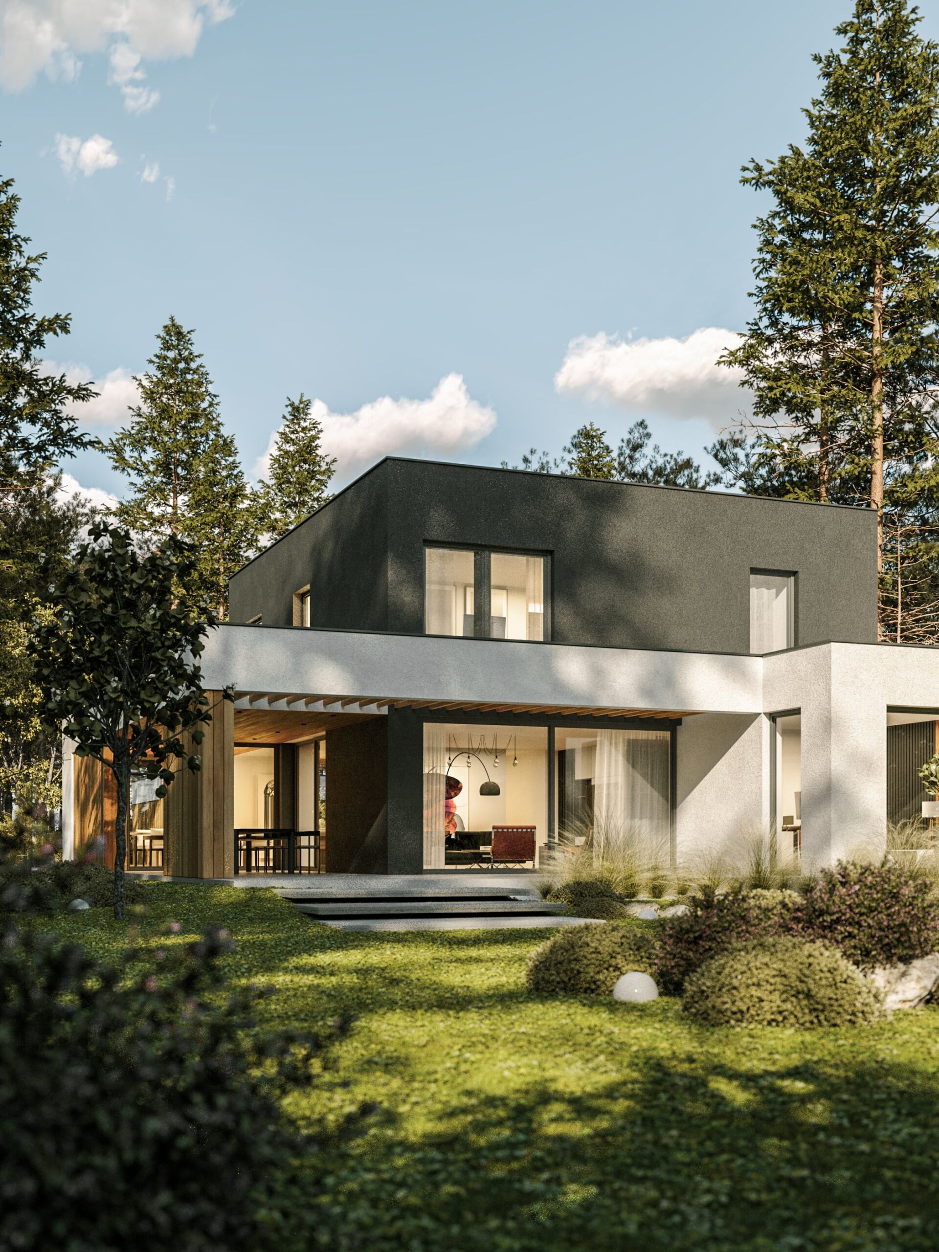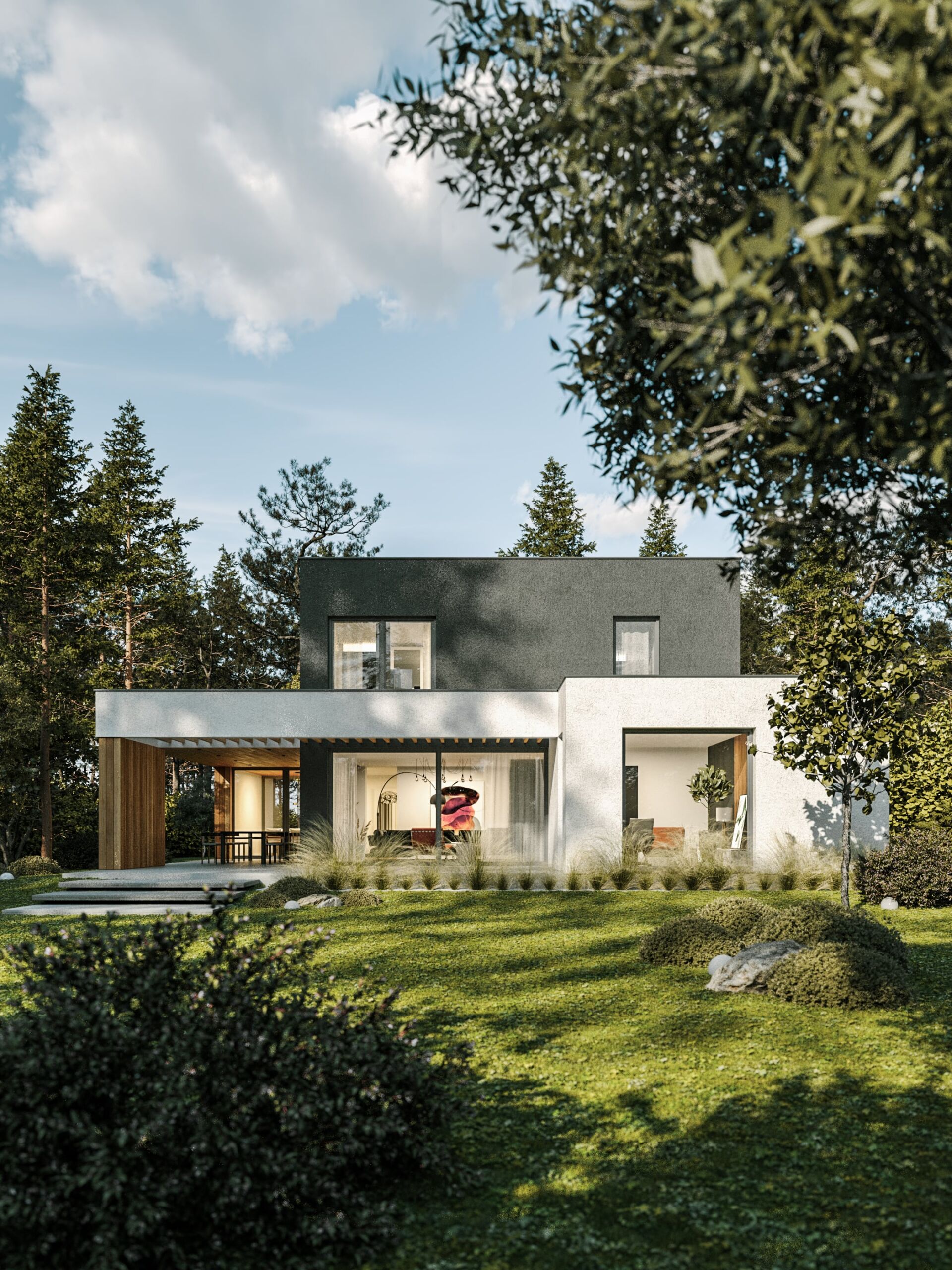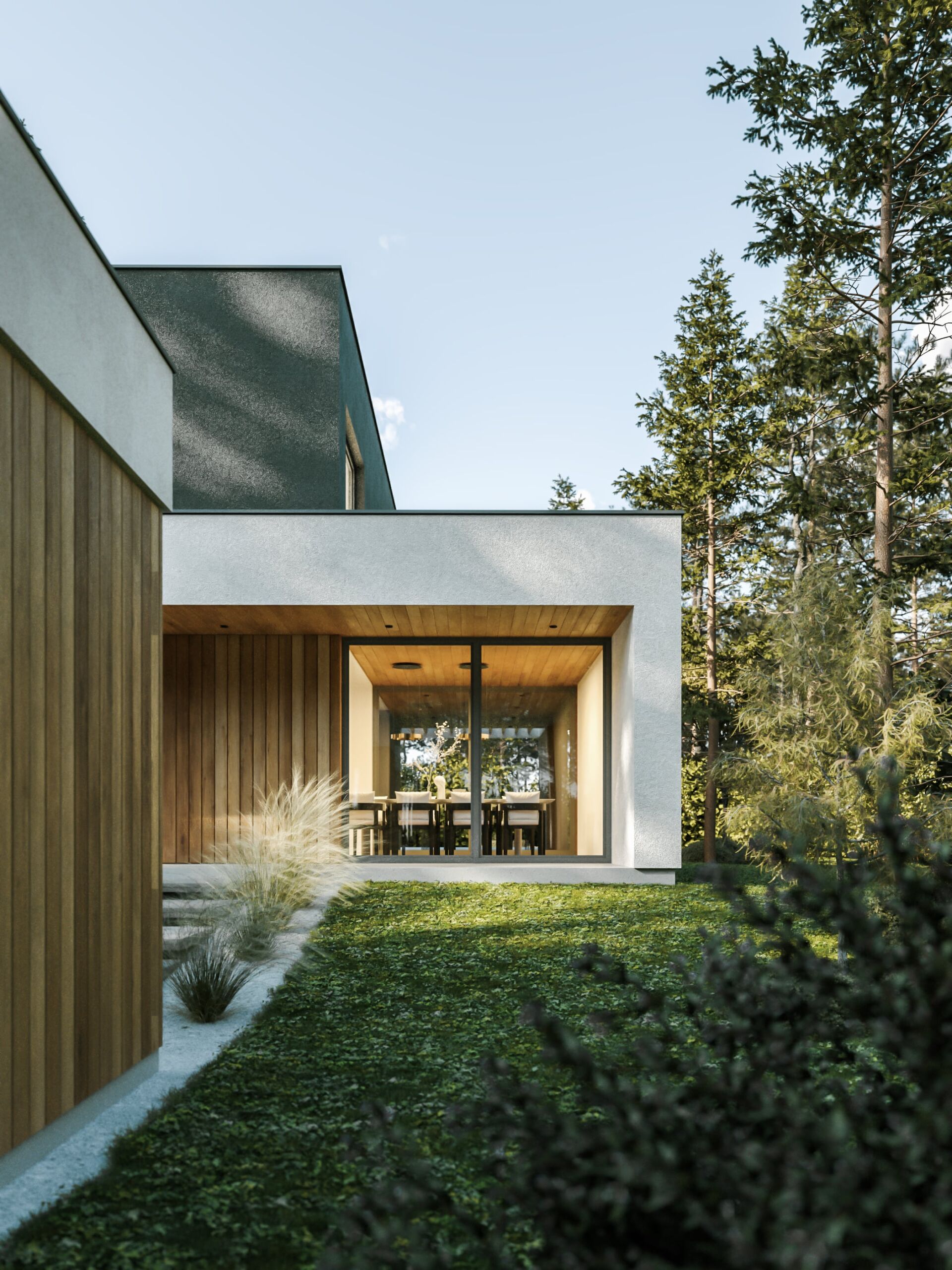 Projekt zakłada przebudowę i rozbudowę istniejącego domu w Zofiówce. Główne zmiany zaszły w obrębie parteru, gdzie przeniesiono wejście do domu od strony wjazdu na działkę. Dodatkowo otwarto rzut parteru tak aby uzyskać bezpośredni widok z salonu na otaczającą zieleń. Dom został powiększony o zaledwie 15m2 powierzchni użytkowej, w której umieszczono przeszkloną jadalnię i część strefy wejściowej. Salon i jadalnia uzyskały również tarasy, których ściany komponują otwarcia na rozległy teren działki.