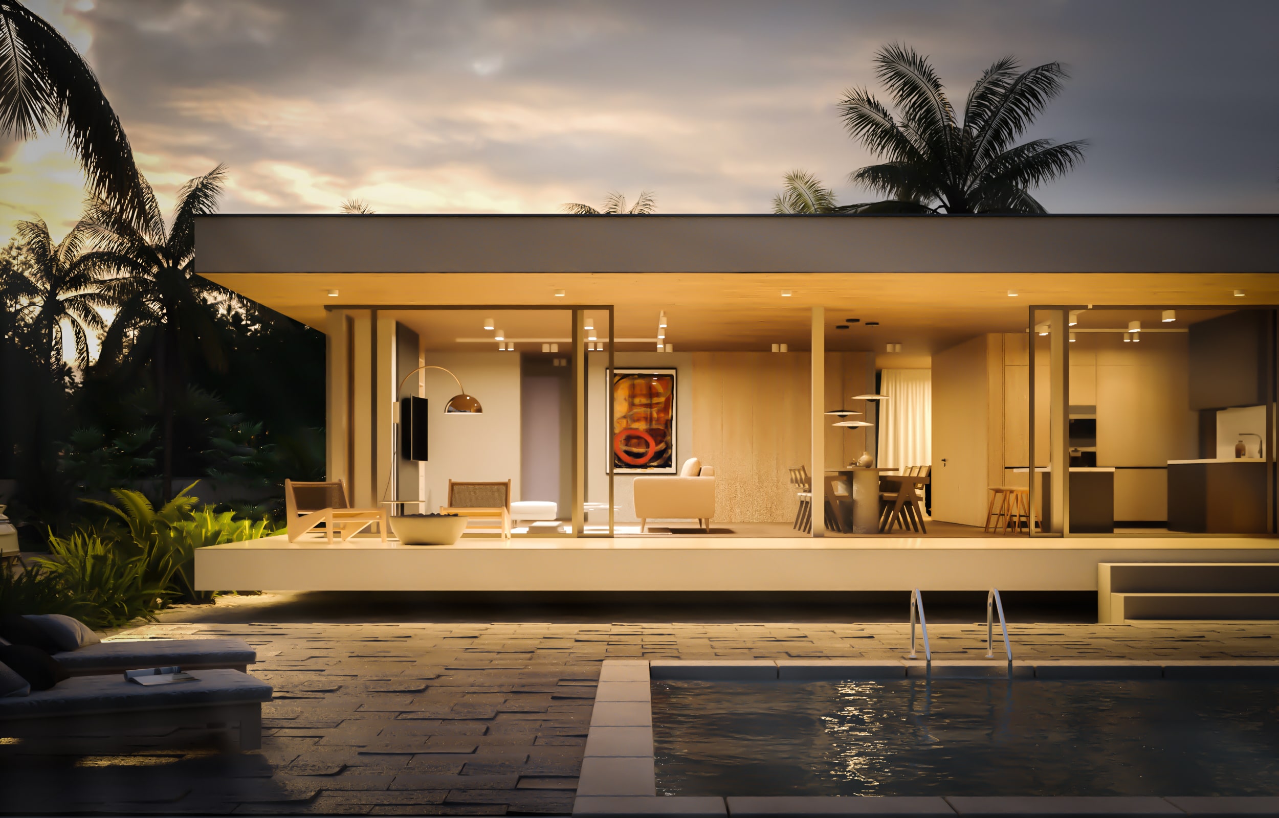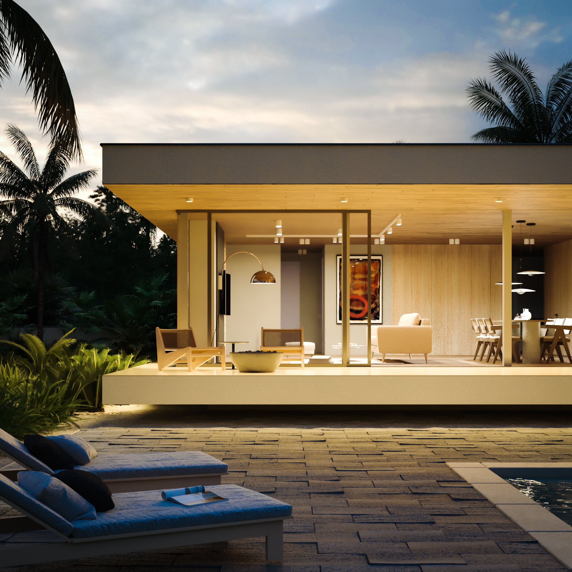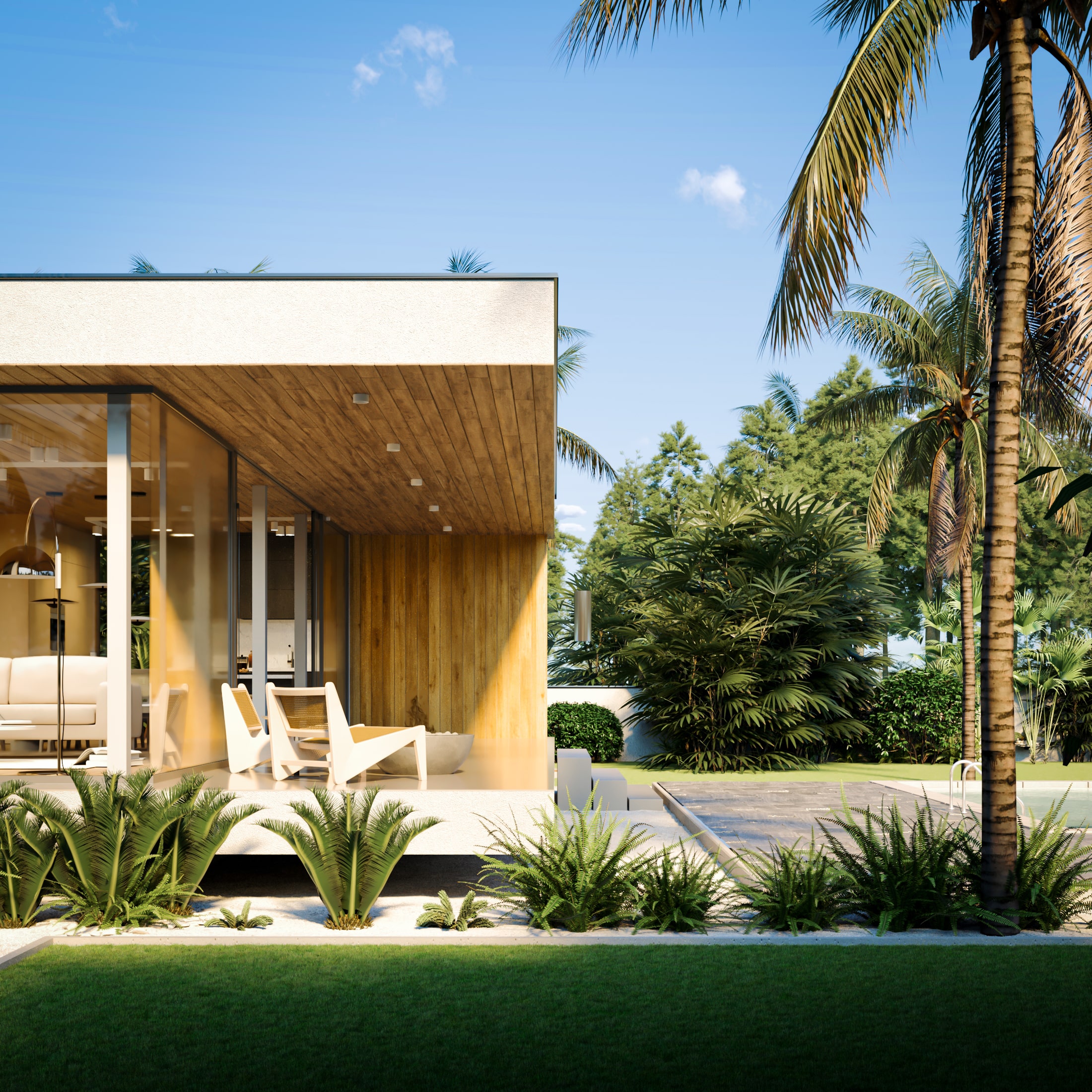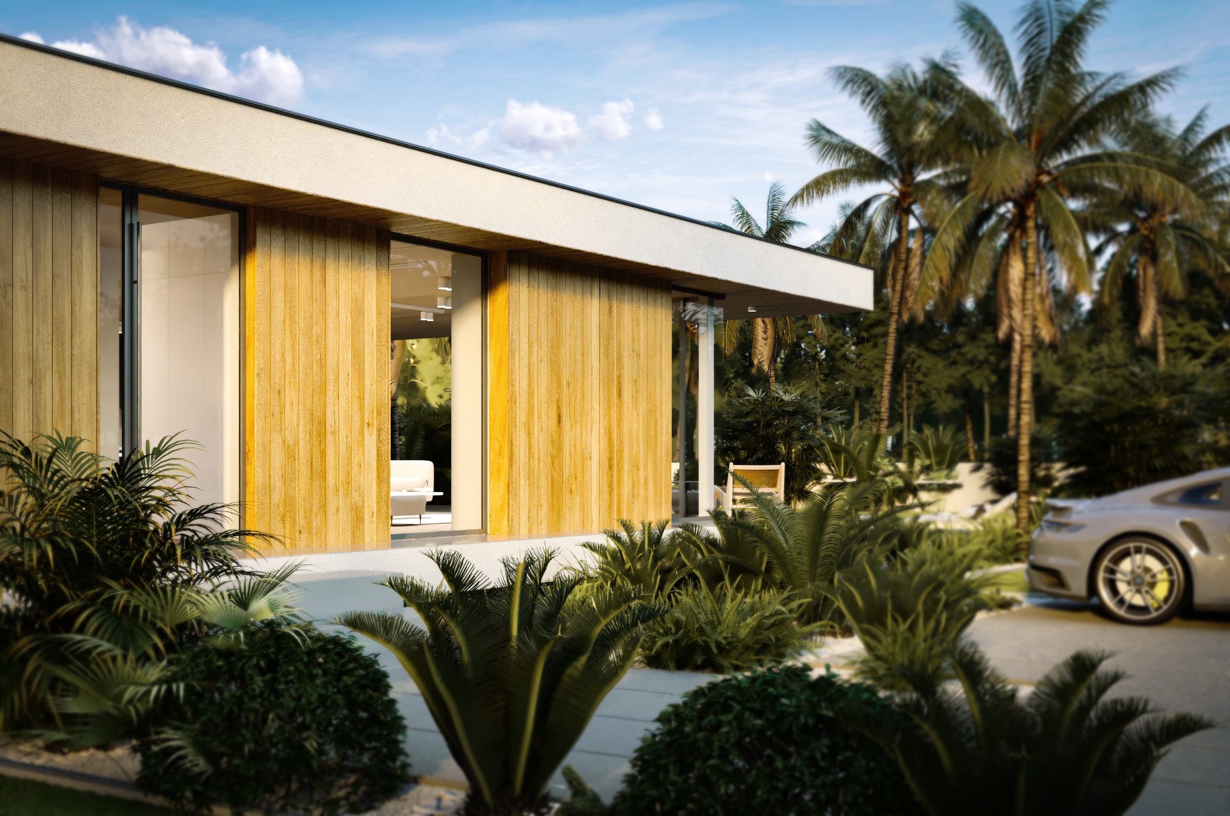 Projektowany dom jednorodzinny ukształtowano jako parterowy budynek o zwartej, nowoczesnej formie przekrytej płaskim dachem. Elewacje wykończono białymi płytami elewacyjnymi oraz drewnem, które podkreślają prostą i elegancką kompozycję. Niezależny, jednokondygnacyjny garaż o białej, tynkowanej elewacji uzupełnia zabudowę jako wolnostojący obiekt.