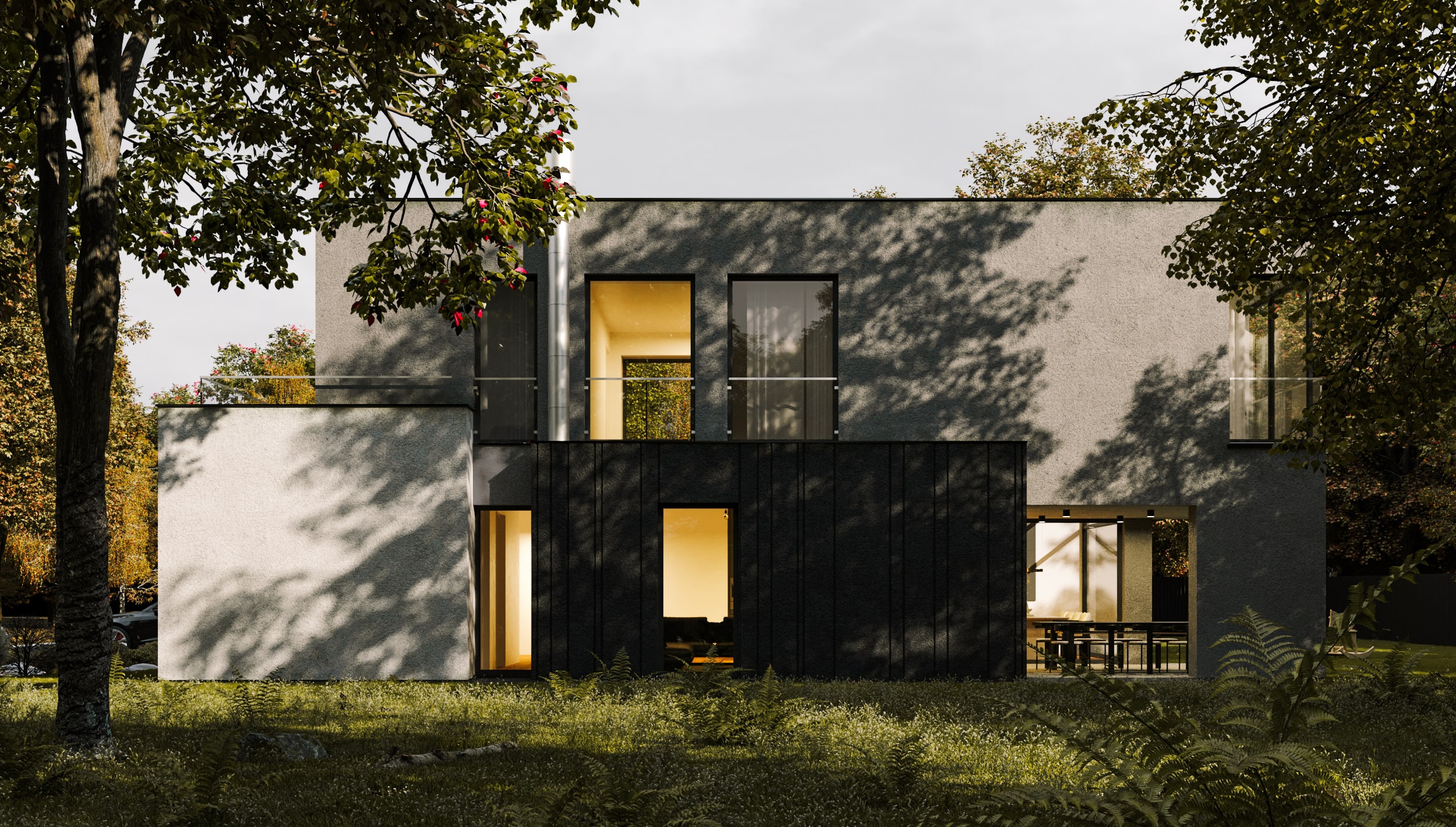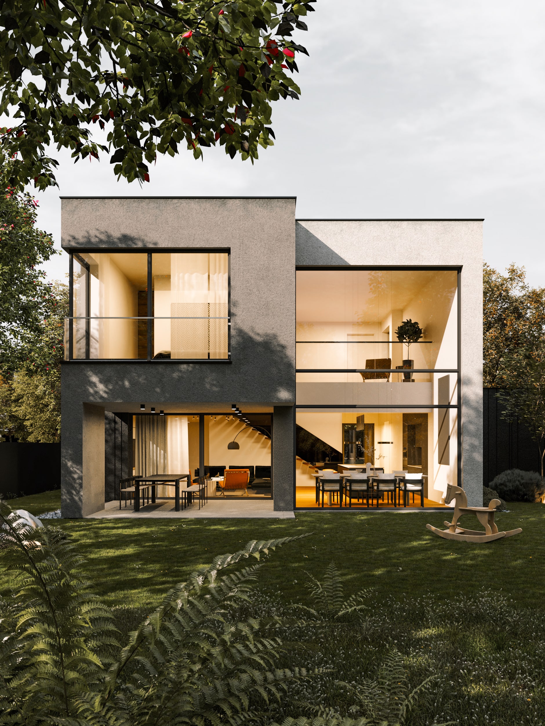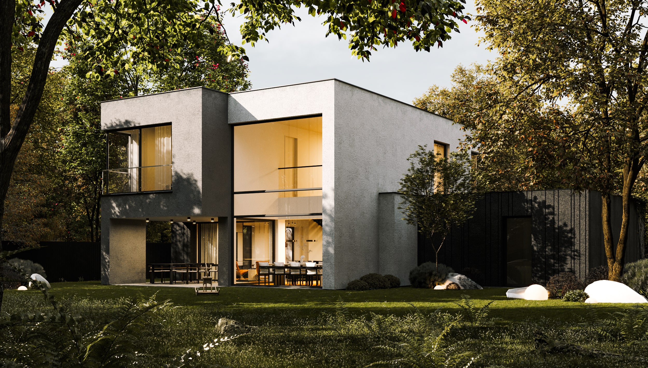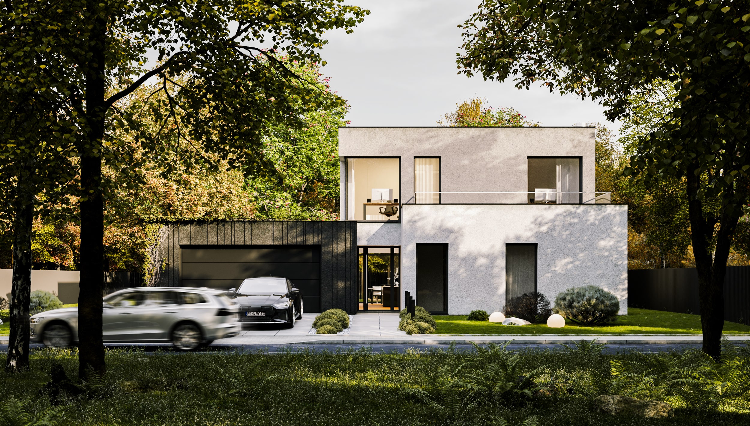 Dom jednorodzinny został osadzony na małej kwadratowej działce gdzie salon i jadalnia z kuchnią mają z trzech stron bezpośredni widok na ogród. Projekt indywidualny domu składa się z połączenia trzech brył, które podkreślone zostały w elewacji frontowej różnymi wykończeniami tynku białego, antracytowego oraz boniowaniem w bryle garażu.