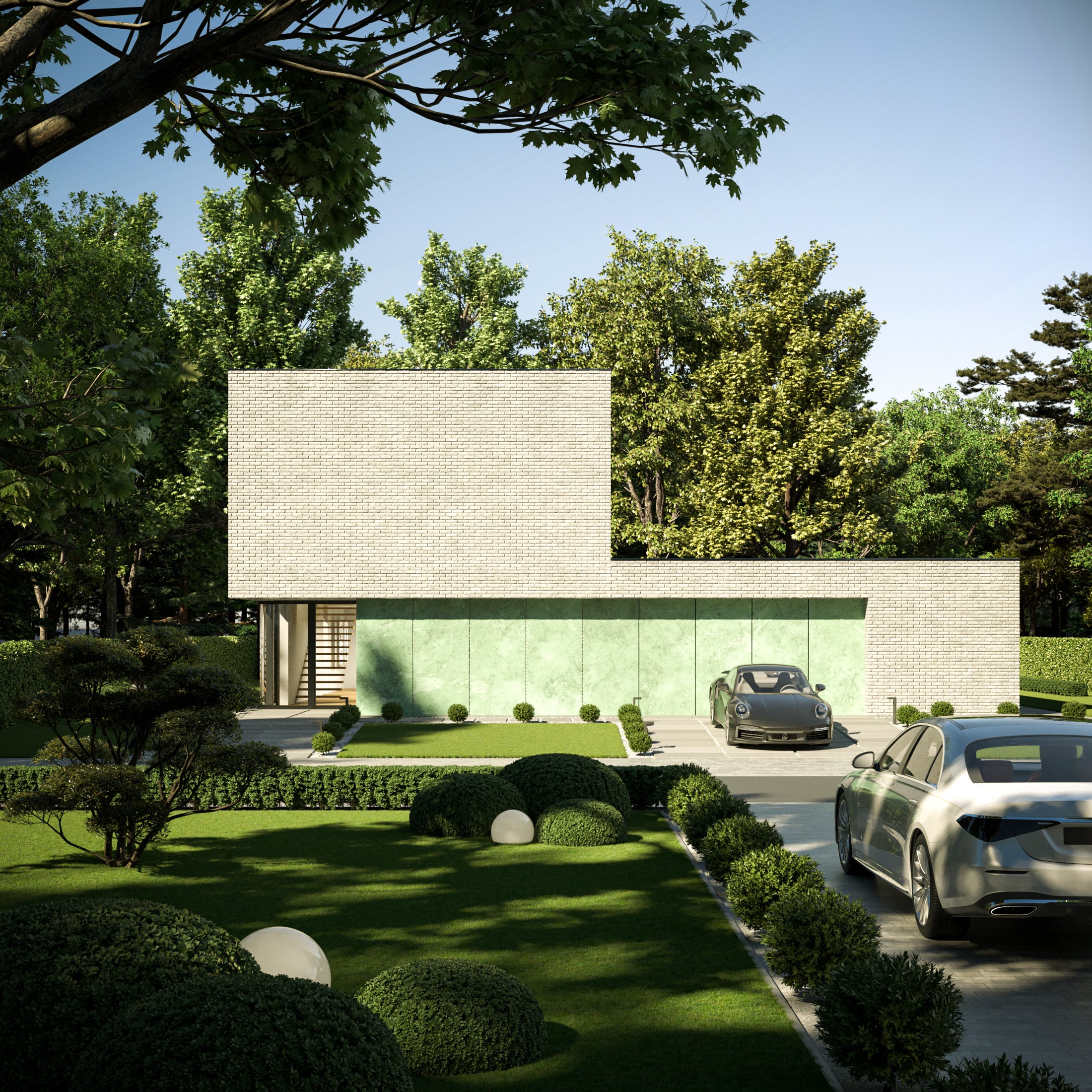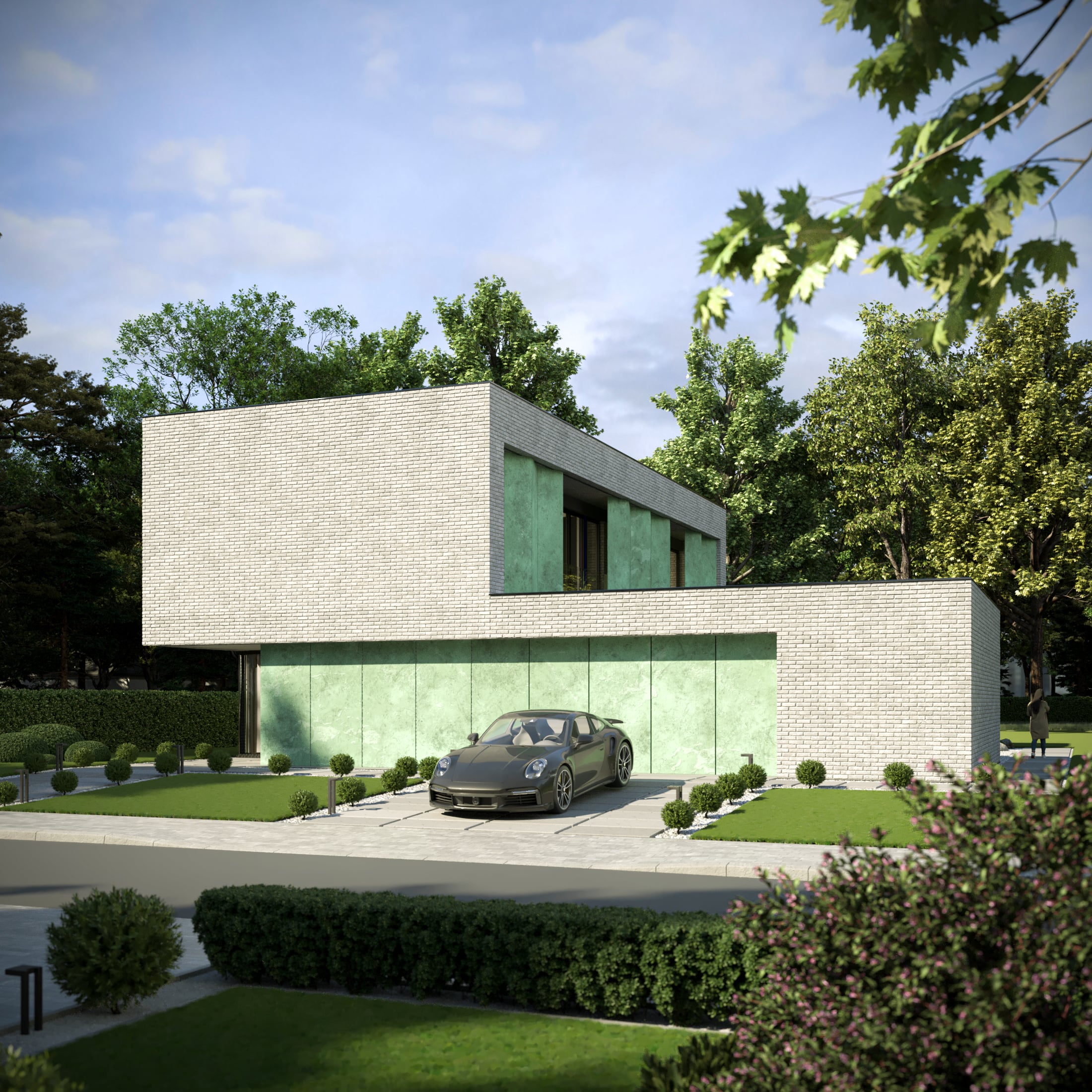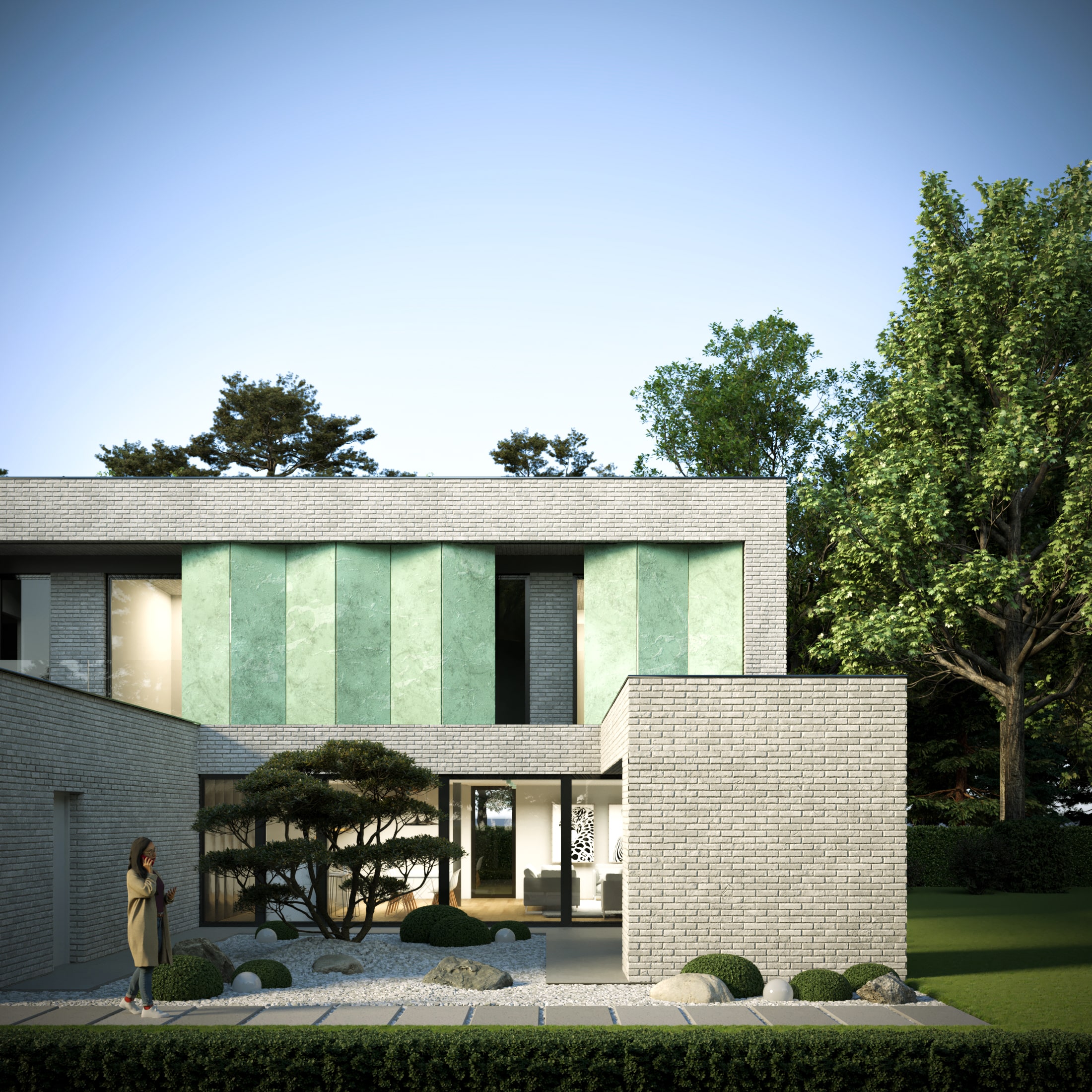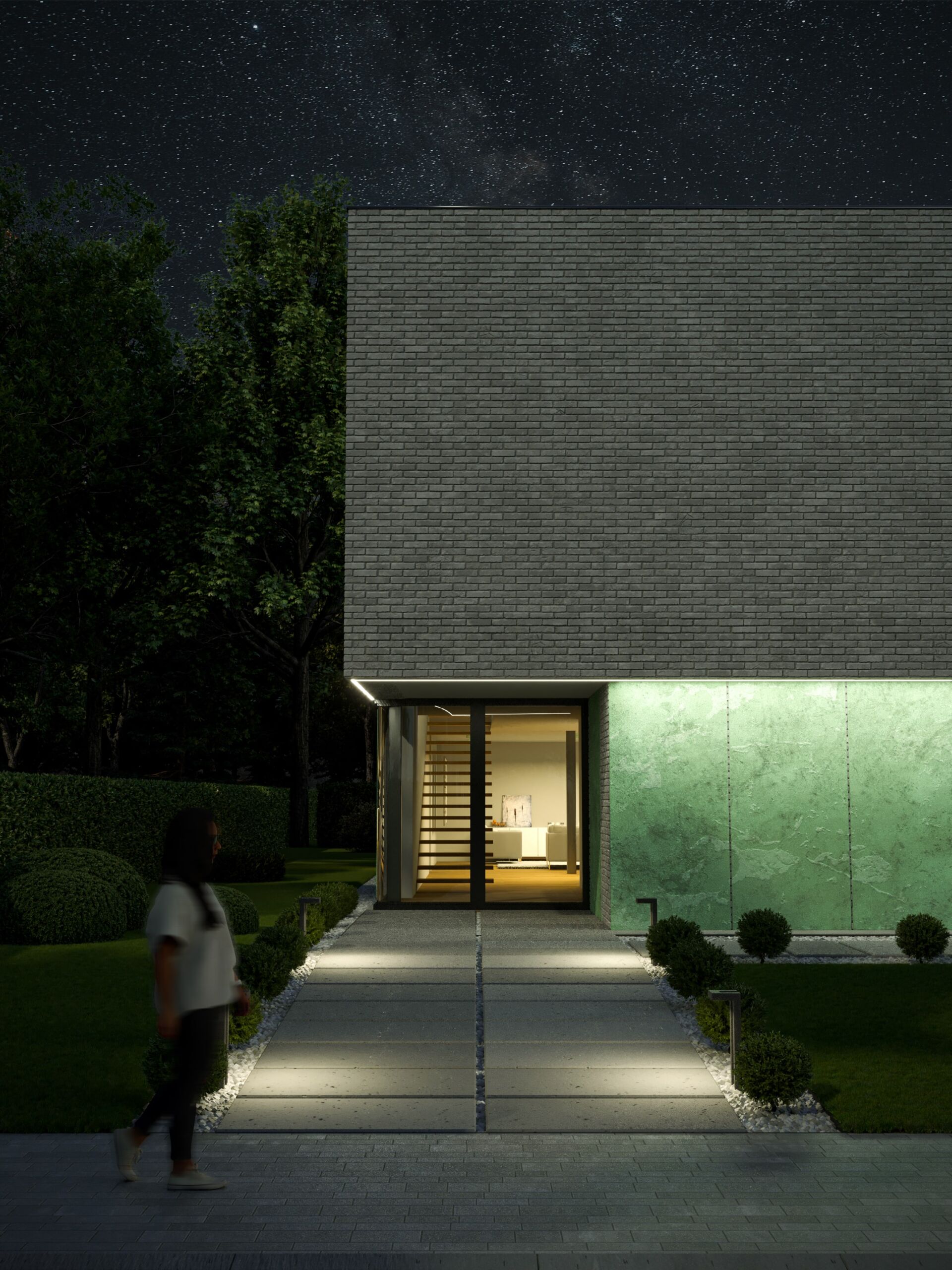 Dom otrzymał prostą formę architektoniczną, a dzięki dużym przeszkleniom światło wpada do środka na przestrzał. Całość bryły została spięta profilami elewacyjnymi oraz kompozycją ścian zewnętrznych, lekko wysuniętych względem płaszczyzn dachu i elewacji.