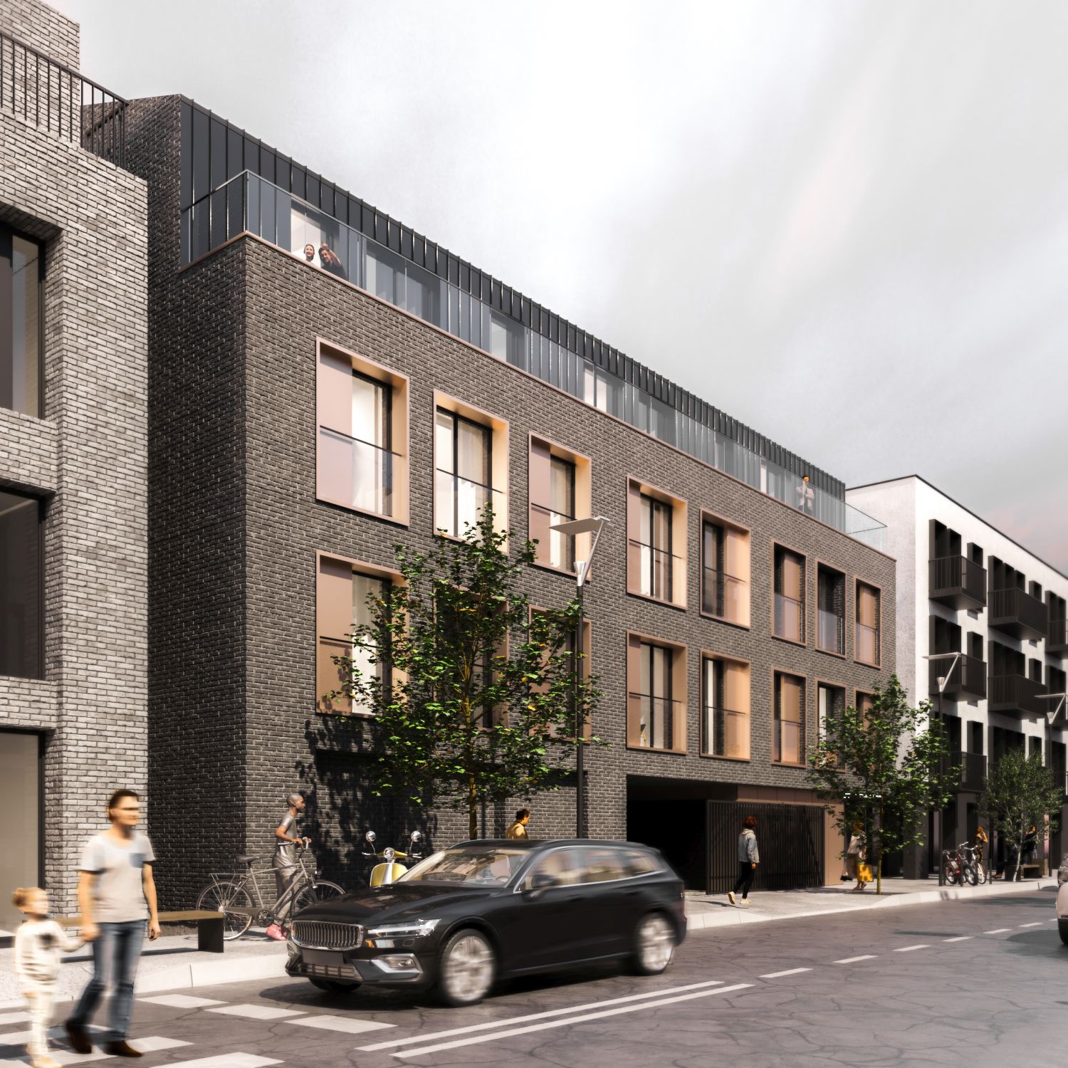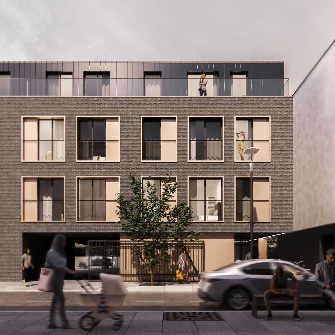 Koncepcja budynku mieszkalnego wielorodzinnego, czterokondygnacyjnego, w zabudowie pierzejowej. Bryła wyróżnia się podcięciem w parterze oraz wsunięciem ostatniej kondygnacji w głąb budynku, dzięki czemu powstał taras z pięknym widokiem. Znaczna część elewacji zaprojektowana jest jako ceglana. Na niej wyróżniają się duże przeszklenia w cofniętych niszach, obramowanych jasną okładziną. Ostania kondygnacja wykończona blachą trapezową jako przedłużenie dachu.