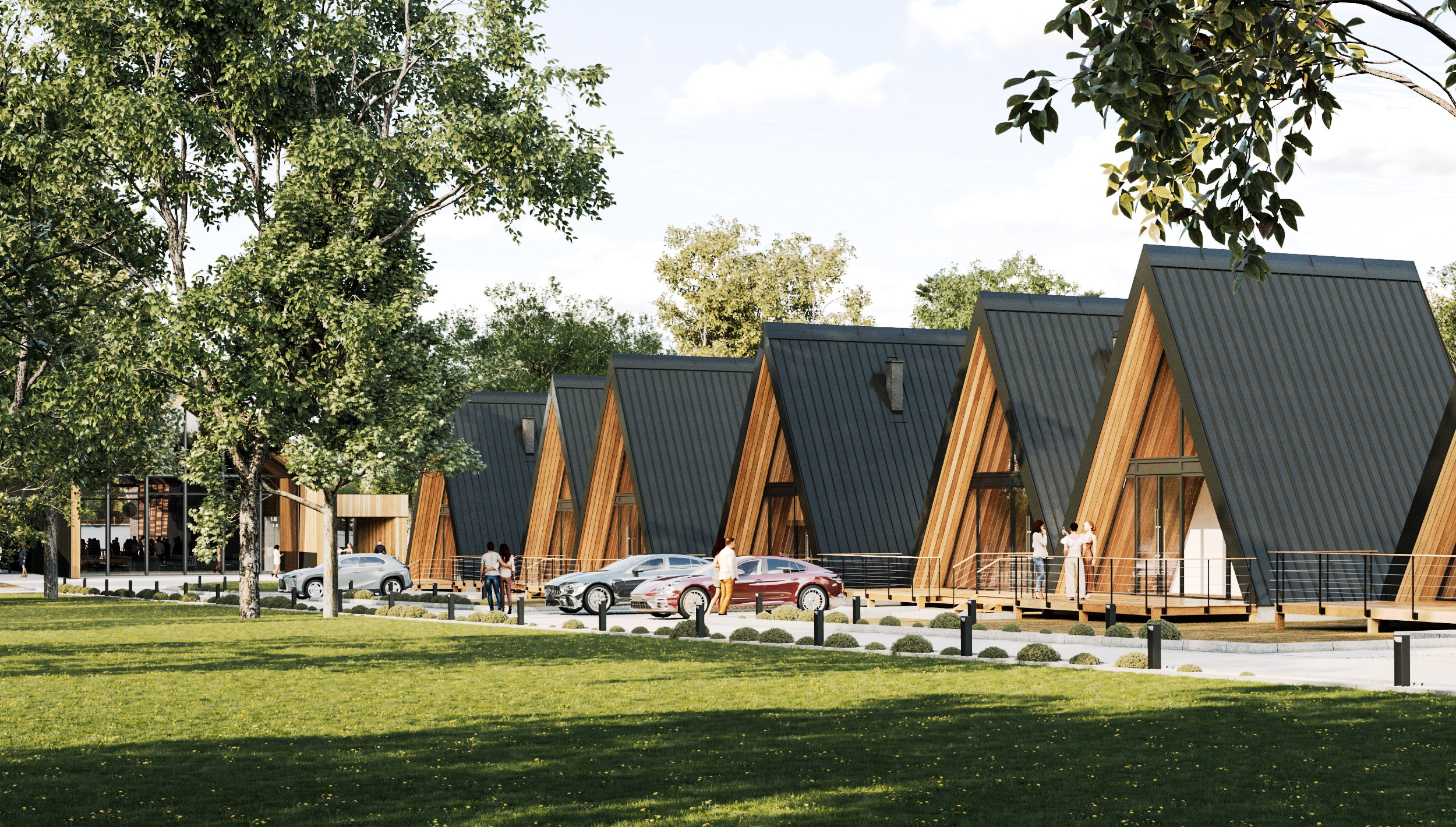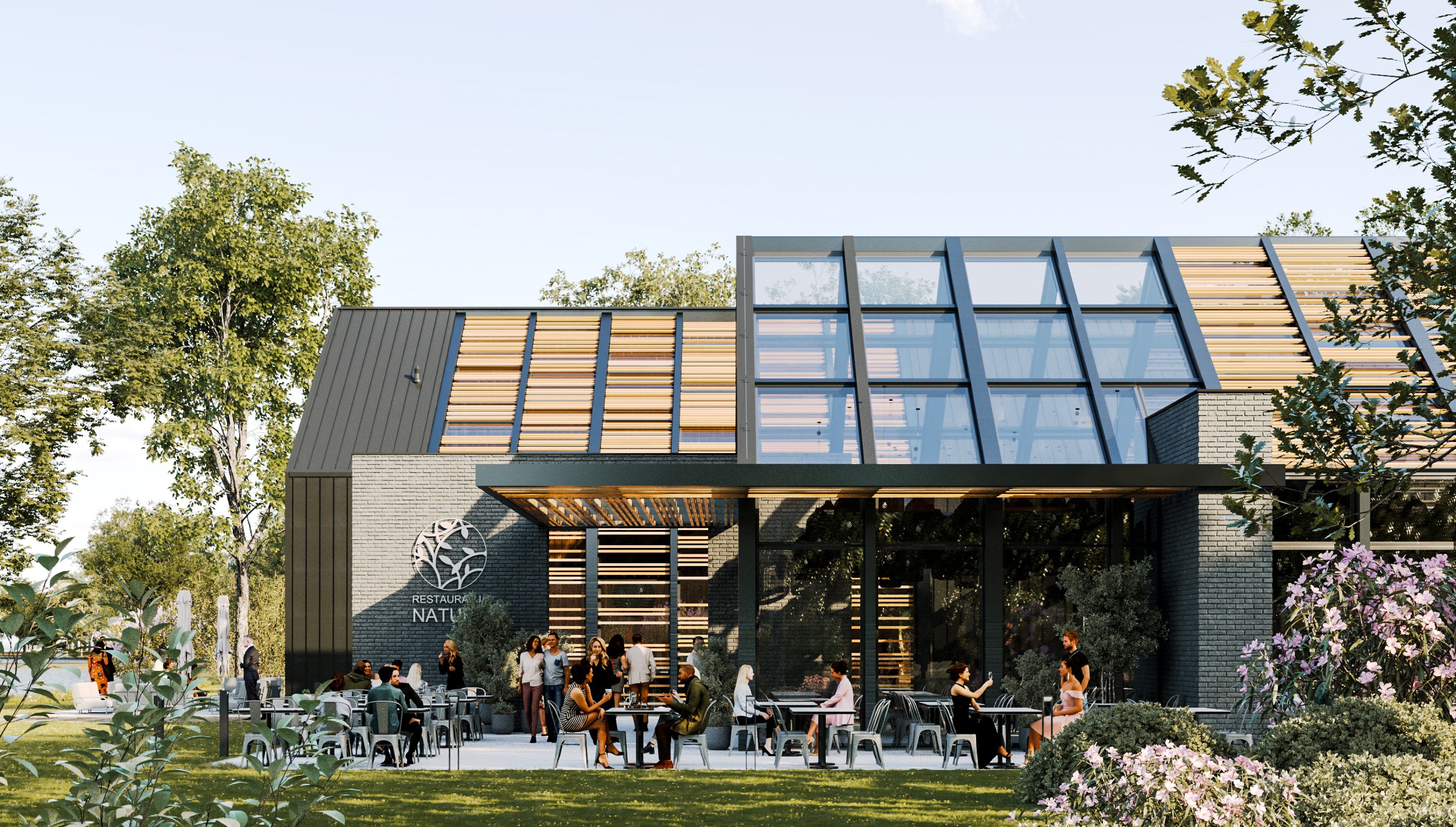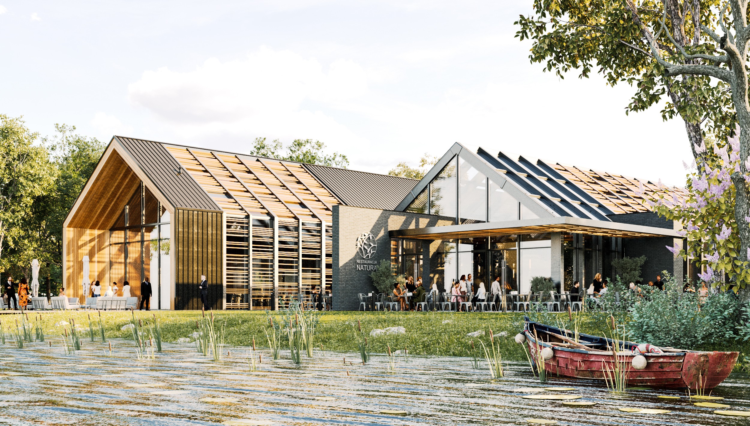 Kompleks restauracyjny z salą do organizowania większych uroczystości wraz z nowoczesnymi brdami mieszkalnymi, został położony w pobliżu jeziora, w otoczeniu gęstej zieleni. Założenie ma tworzyć spójną całość urbanistyczną, która daje możliwość odpoczynku w naturze. Bryły budynków zostały połączone wysokimi przeszkleniami z komunikacją i obłożone drewnem, szarą cegłą oraz panelami stalowymi. Funkcjonalność kompleksu rozszerzono o liczne tarasy zewnętrzne, zorganizowaną zieleń i miejsca odpoczynku.