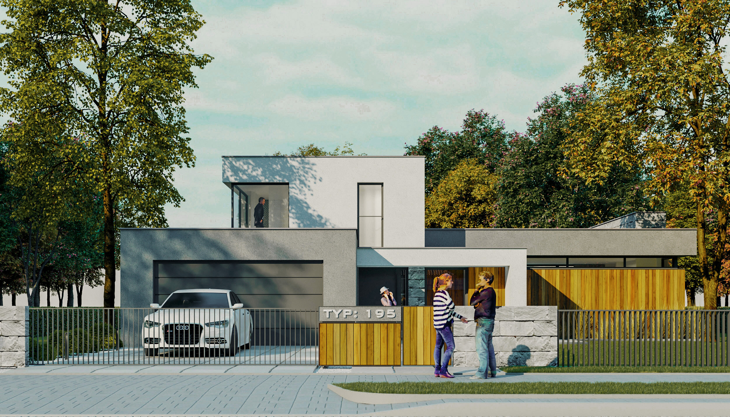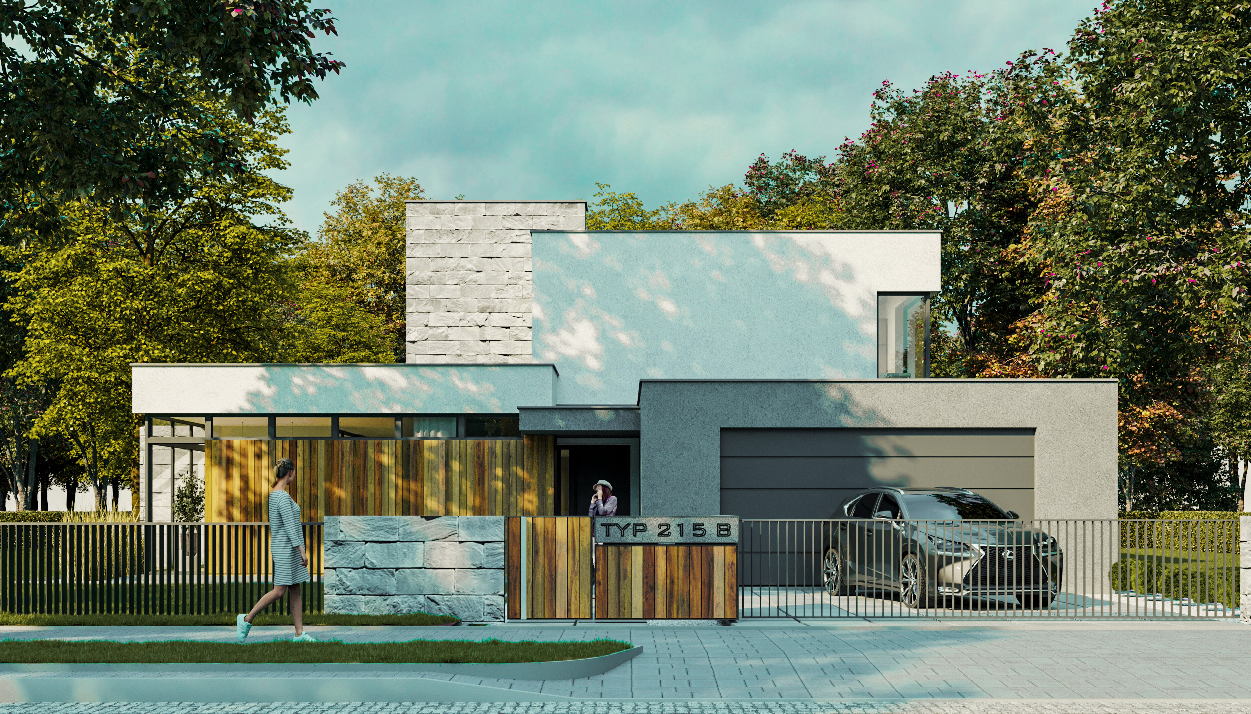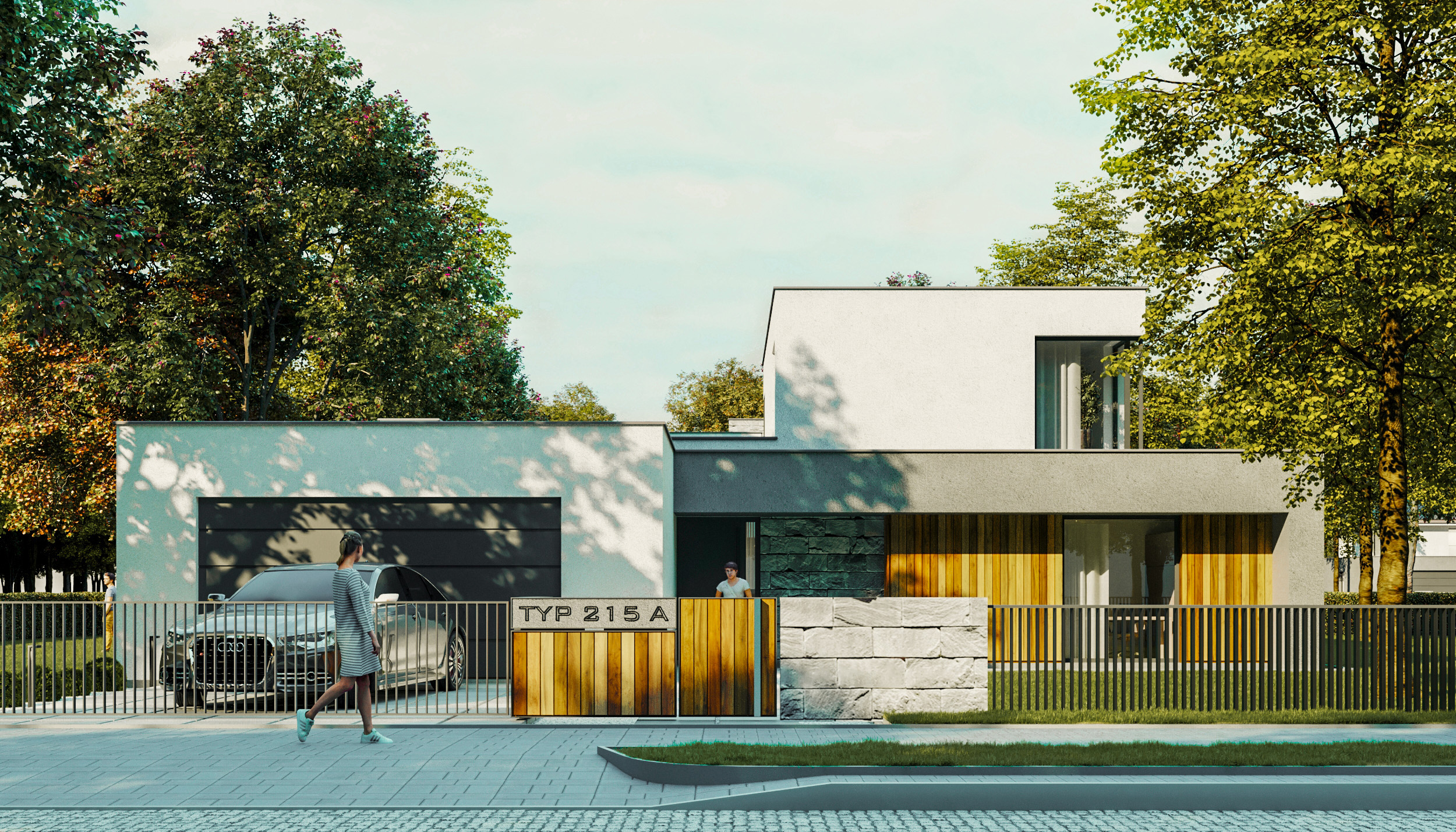 Opis projektu: Projekt osiedla składa się z kompozycji kilkunastu domów-wzorów o różnych powierzchniach od 140 do 215 metrów kwadratowych. W projekcie elewacji zastosowano płyty hpl imitujące drewno oraz kamień łupkowy na bryłach kominków zewnętrznych. Domy wyróżniają się licznymi podcieniami, zadaszeniami oraz wysokimi na całą kondygnację oknami.