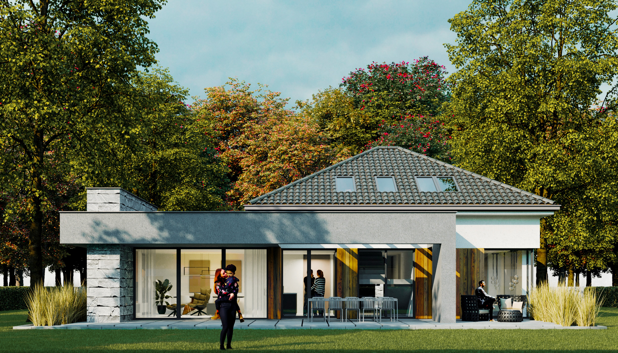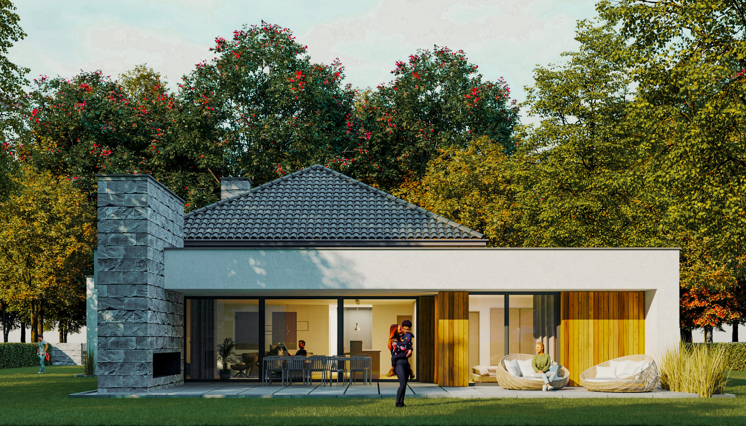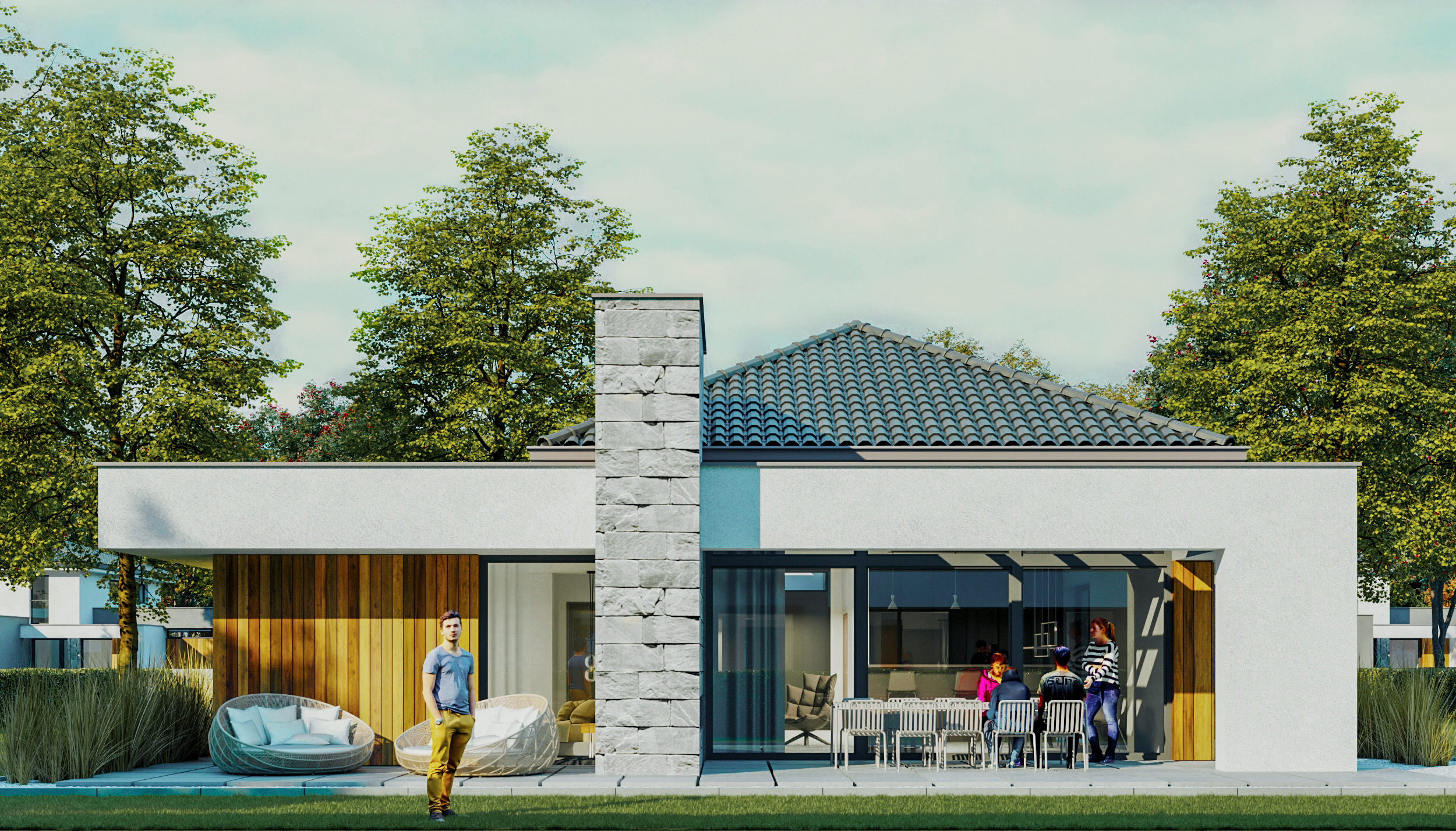 Opis projektu: Projekt osiedla składa się z kompozycji kilkunastu domów-wzorów o różnych powierzchniach od 140 do 215 metrów kwadratowych. W projekcie elewacji zastosowano płyty hpl imitujące drewno oraz kamień łupkowy na bryłach kominków zewnętrznych. Domy wyróżniają się licznymi podcieniami, zadaszeniami oraz wysokimi na całą kondygnację oknami.