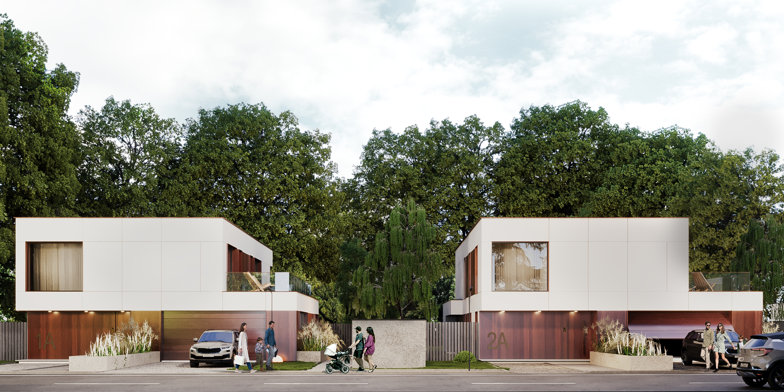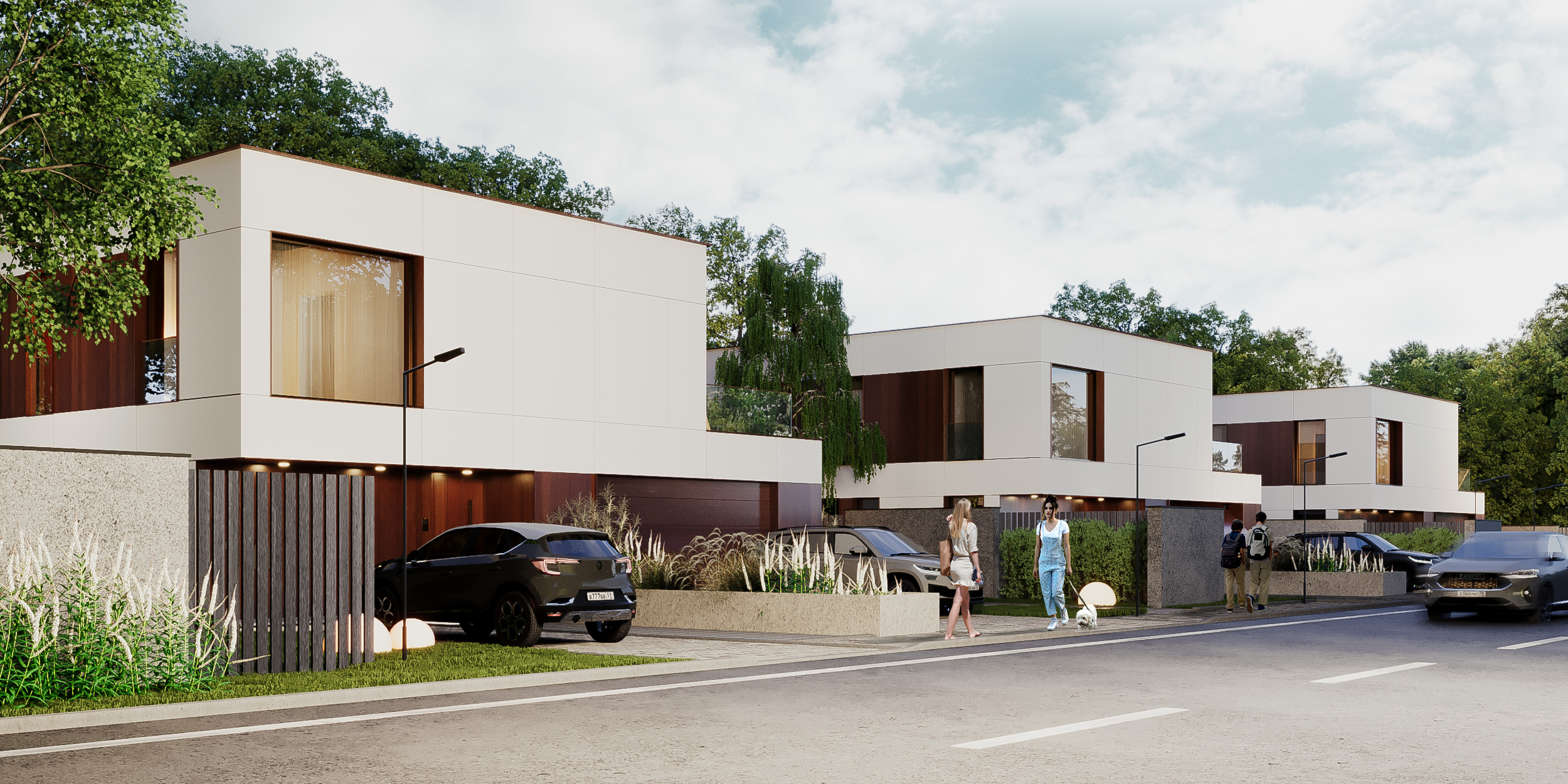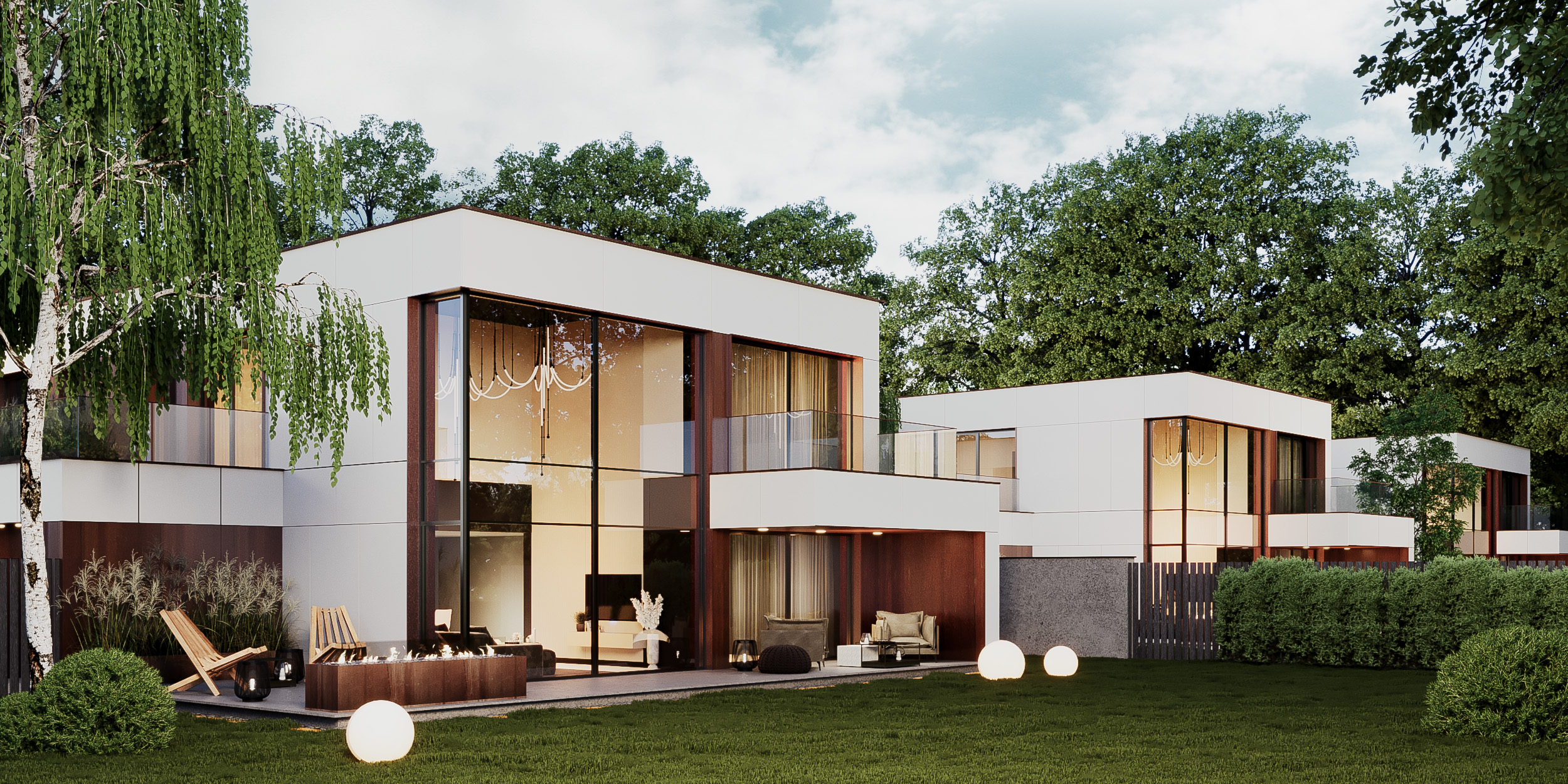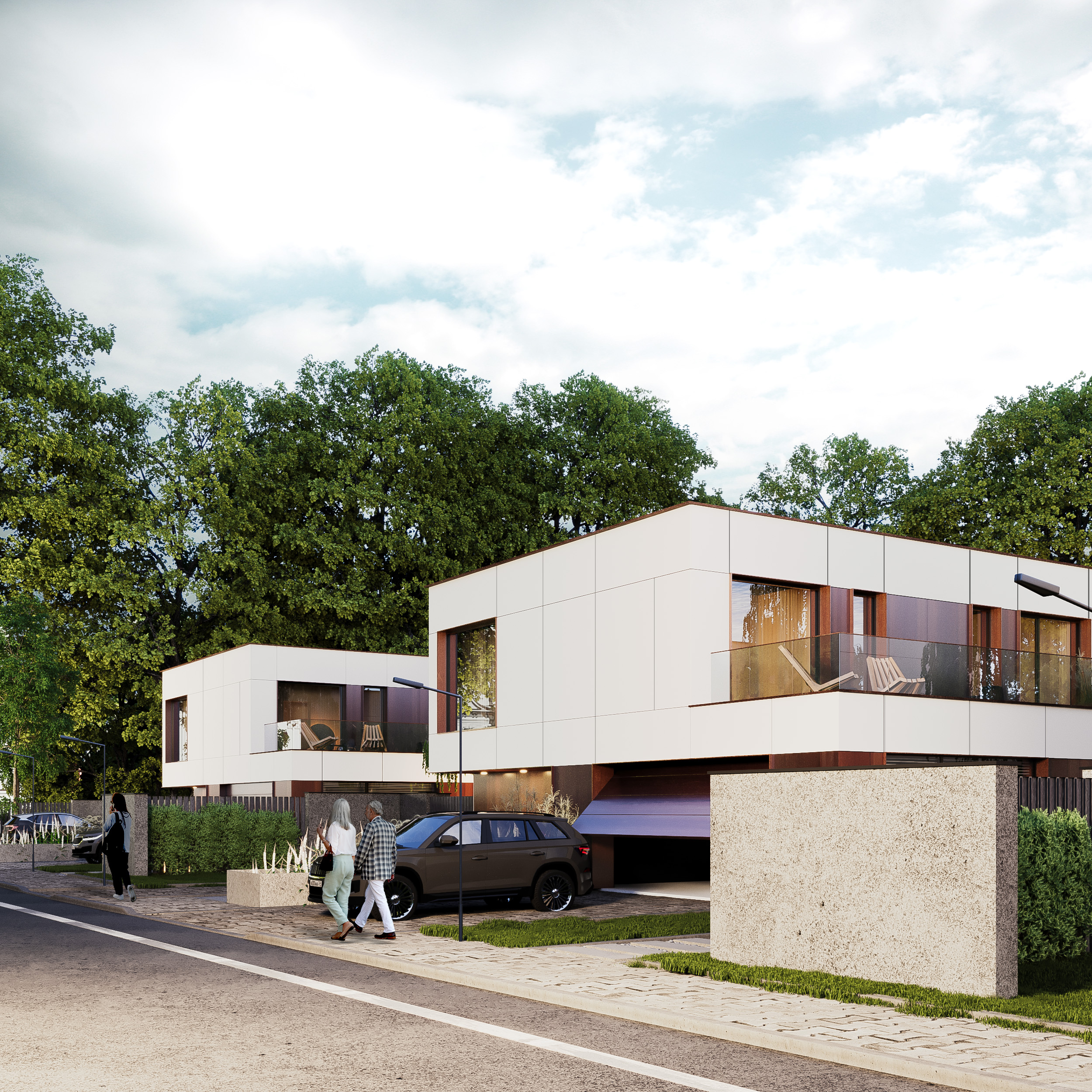 Kompleks składa się z 3 domów, wyróżniających się cortenowymi elementami w elewacji, wszystko w otoczeniu wysokiej zieleni. Ich bryły są proste, nawiązujące do modernistycznych kostek. Okna w domach uzyskały pełne wysokości kondygnacji, dzięki czemu wnętrza są rozświetlone i w stałym kontakcie z zewnętrzem.