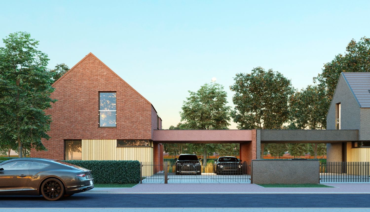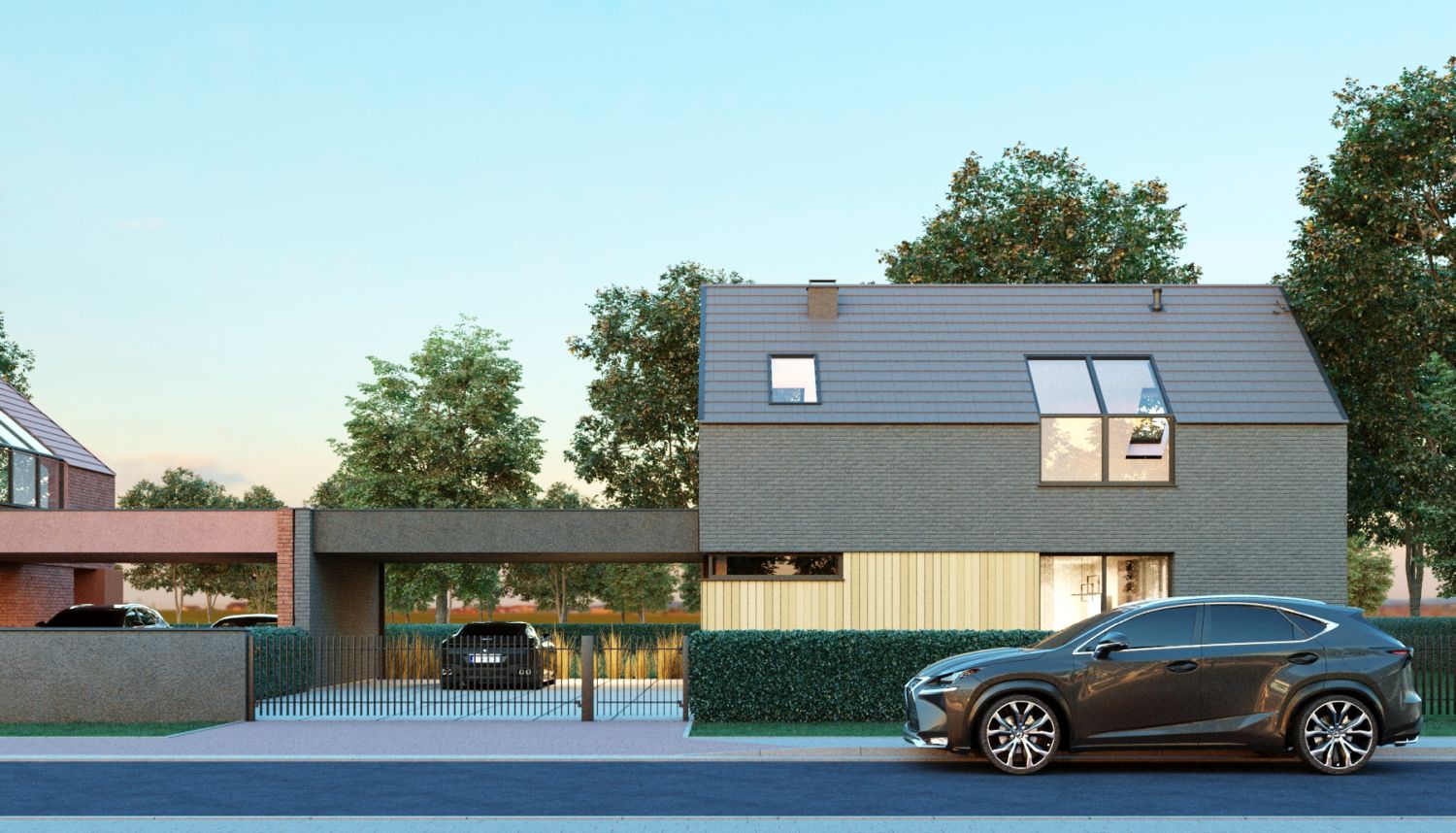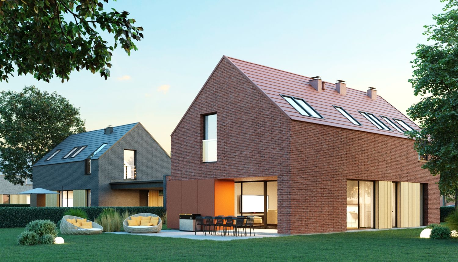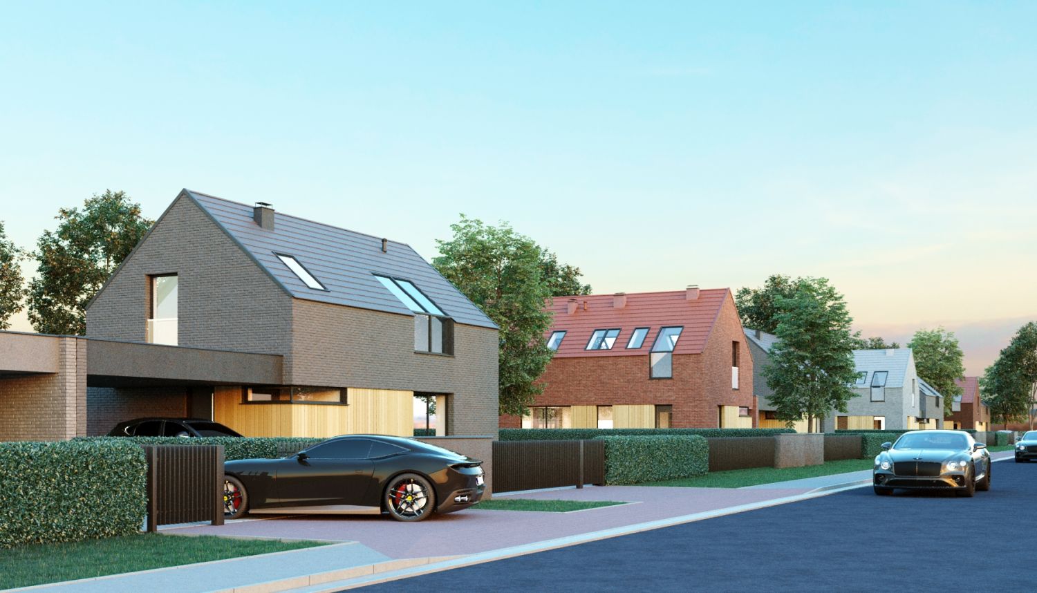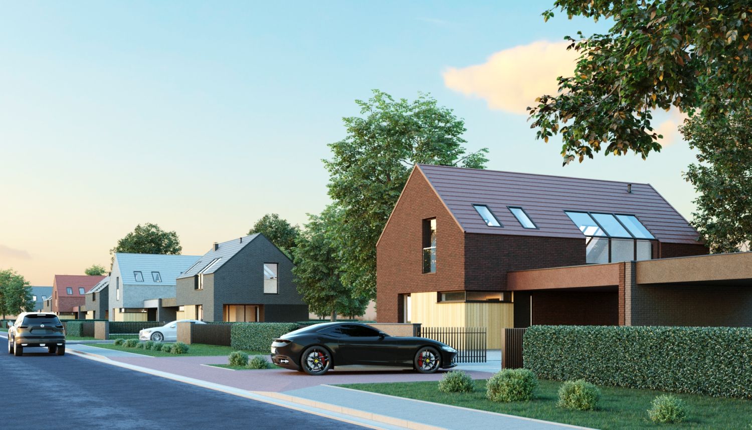 Projekt domów wpisany został w kompozycję urbanistyczną, złożoną z par budynków jednorodzinnych, połączonych wiatami garażowymi. Budynki naprzemiennie zostały zlokalizowane równolegle oraz prostopadle do ulicy, tworząc charakterystyczną i zróżnicowaną linię zabudowy. Dzięki takiemu rozwiązaniu, uniknięto monotonnej i jednolitej zabudowy ulicy osiedla, dodatkowo podkreślając każdy budynek elewacją ceglaną w różnych kolorach.
