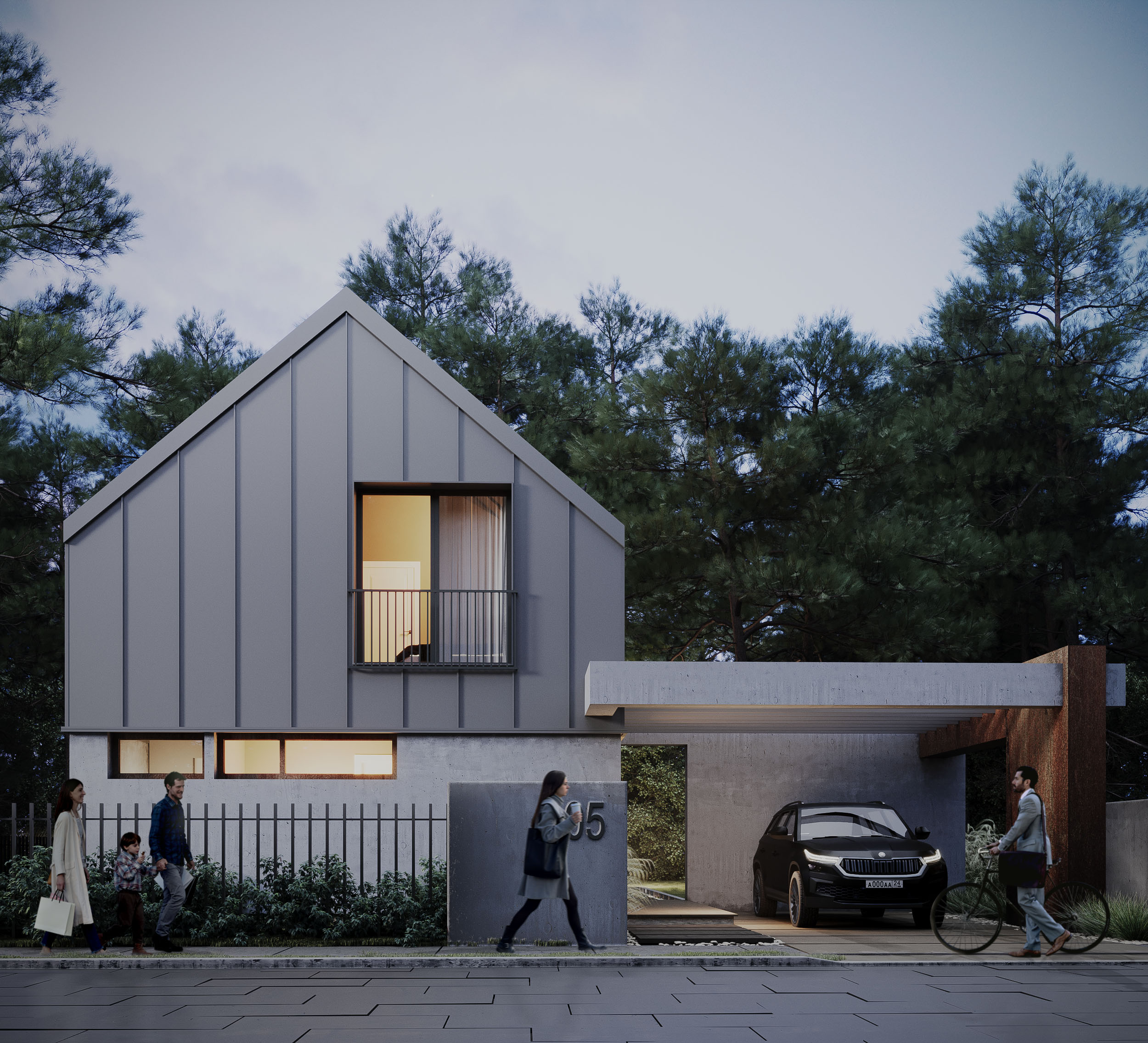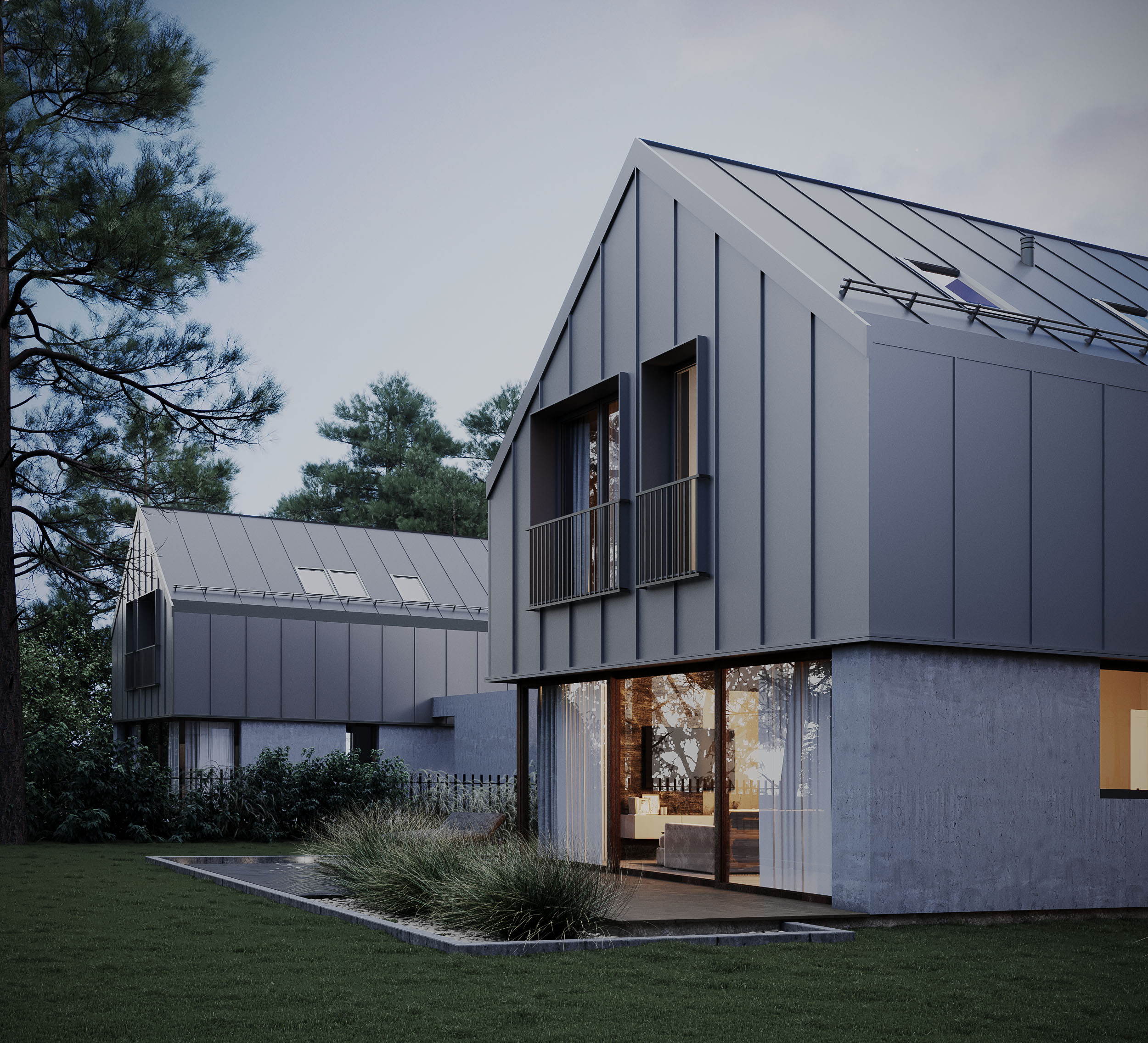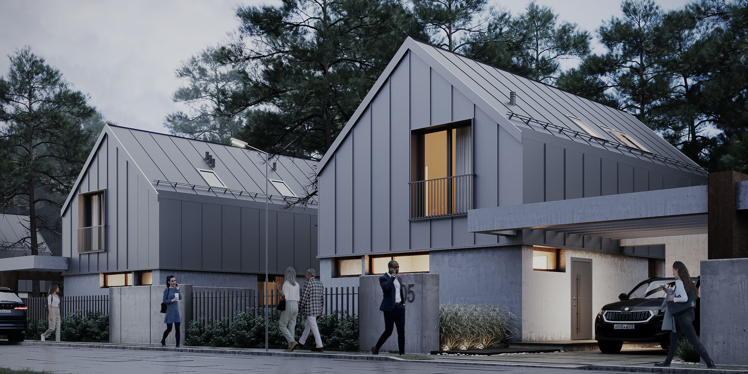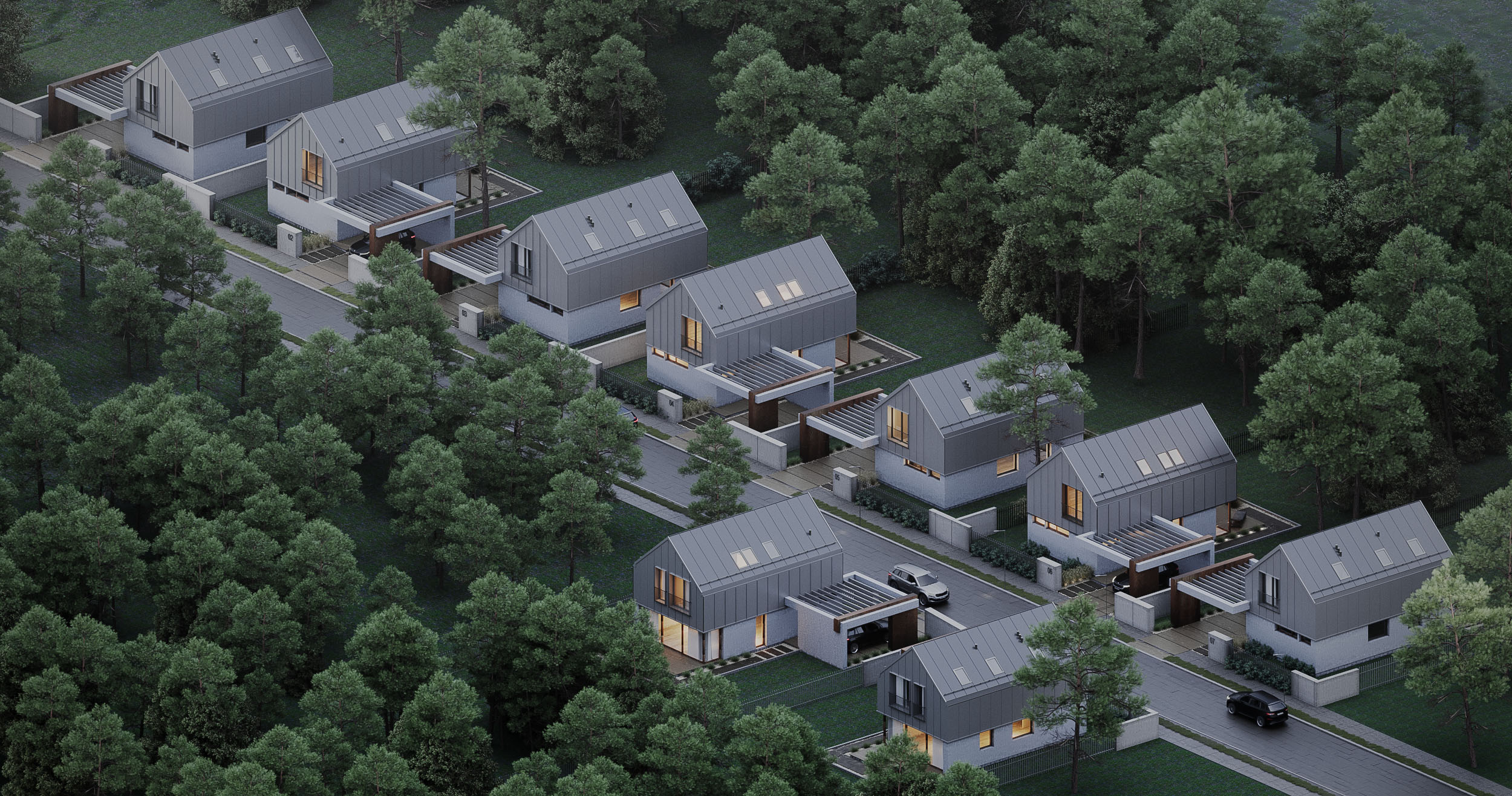 Projekt osiedla dwukondygnacyjnych domów jednorodzinnych o dwuspadowych dachach w delikatnej kolorystyce o szarych tonach. Całość kompozycji dopełniają pergole nad miejscami postojowymi.