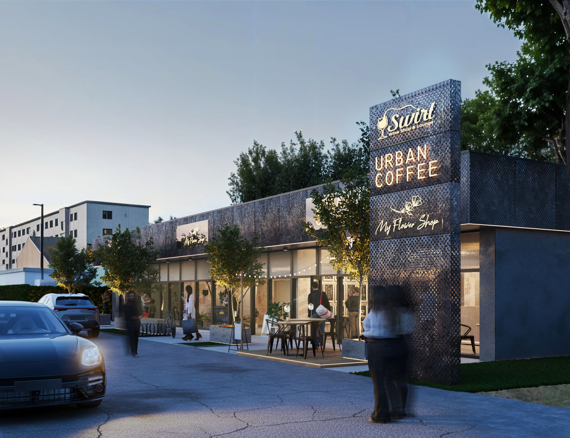 Pawilon handlowy w Pabianicach został zaprojektowany jako nowoczesna, jednokondygnacyjna zabudowa z dużymi przeszkleniami, które podkreślają lekkość obiektu. Elewację dodatkowo urozmaicają panele z perforowanej blachą w ciepłym miedzianym odcieniu. Budynek harmonijnie wpisuje się w otoczenie dzięki niskiej skali i zieleni komponującej się z przestrzenią miejską. Przestrzeń frontowa, zaakcentowana dodatkowo pylonem, pełni funkcję przyjaznej strefy pieszej sprzyjającej swobodnemu przepływowi użytkowników.