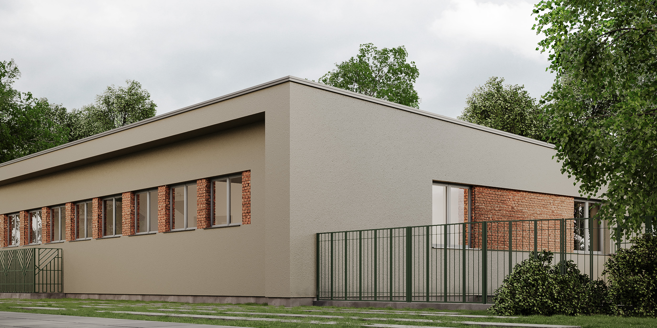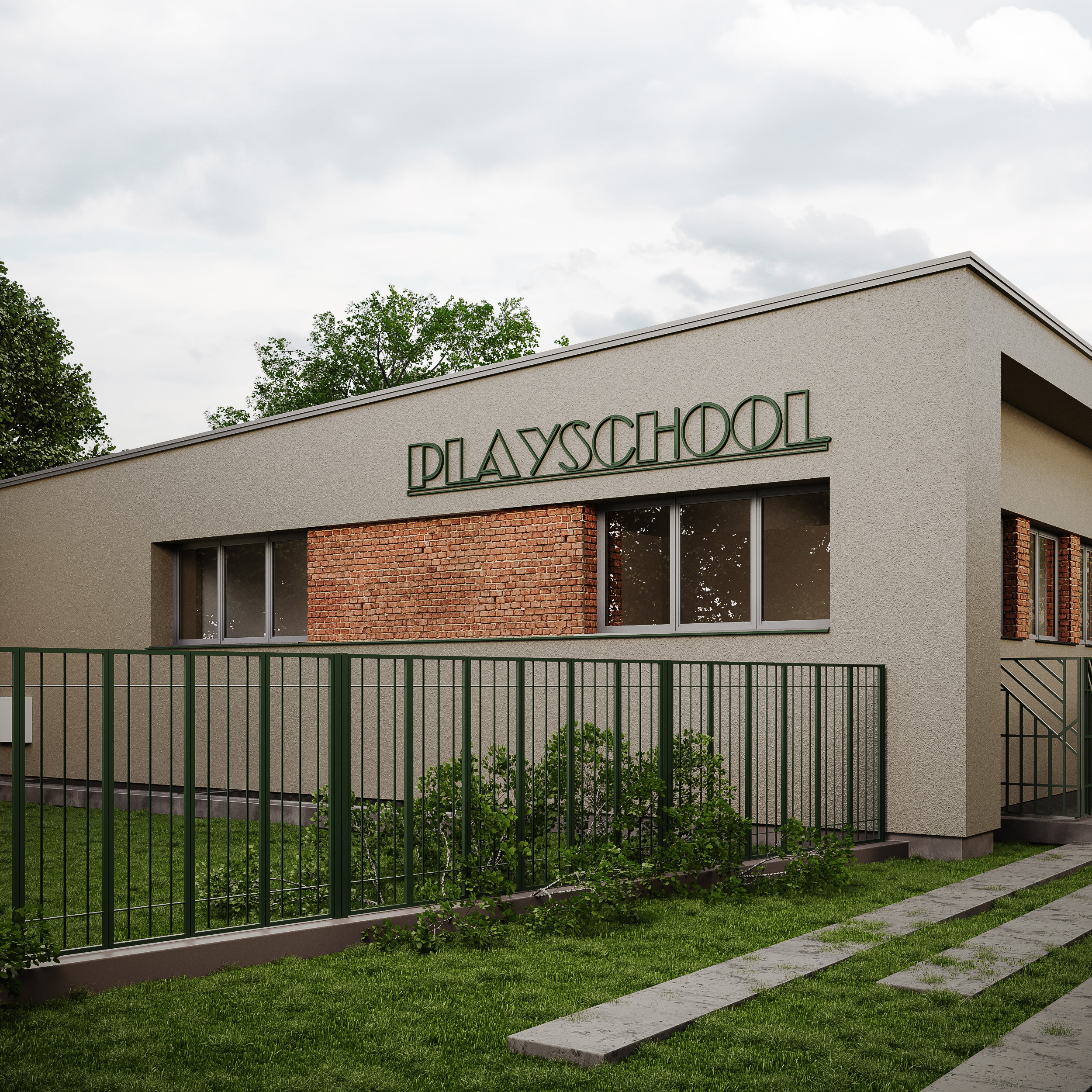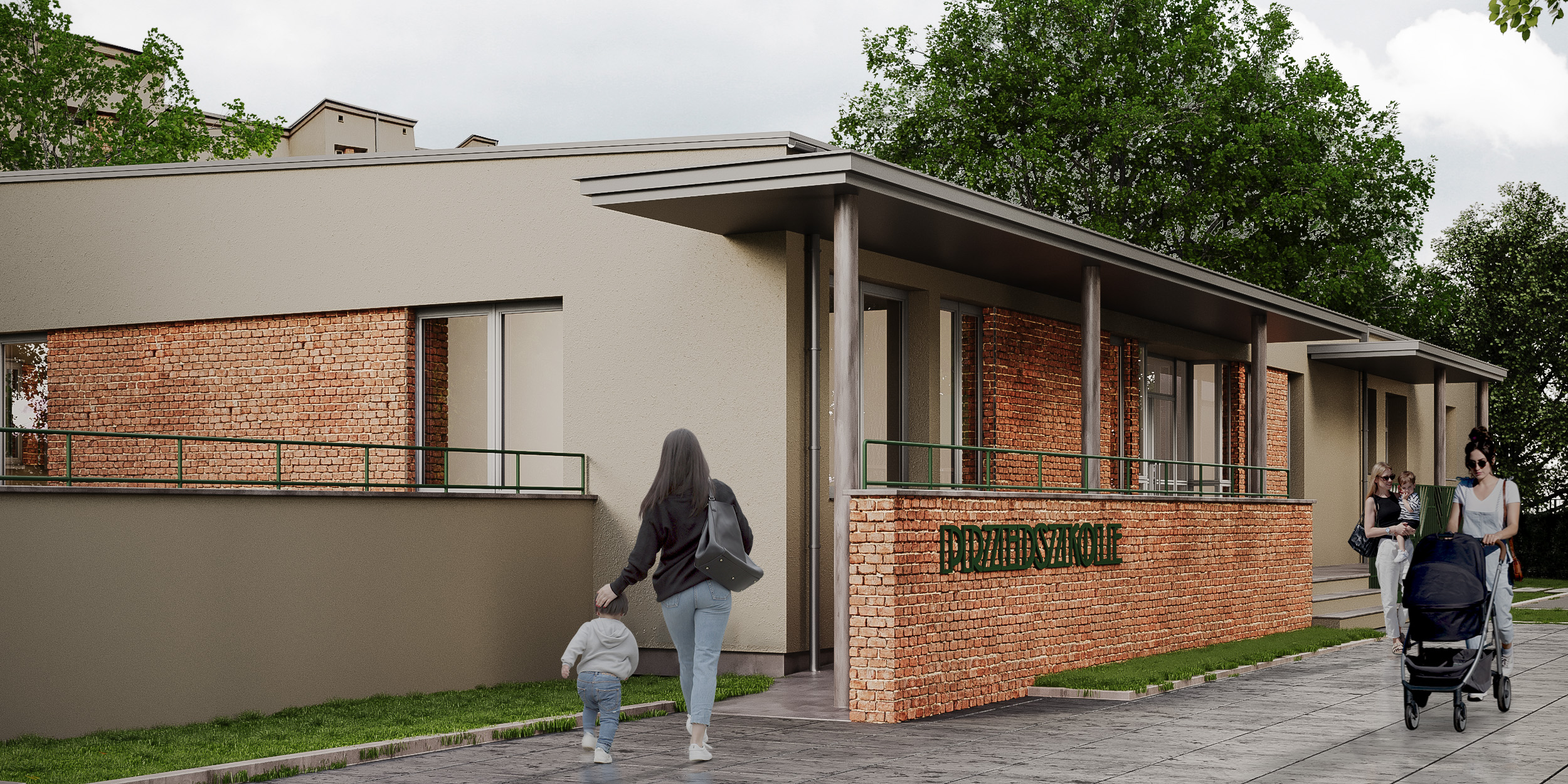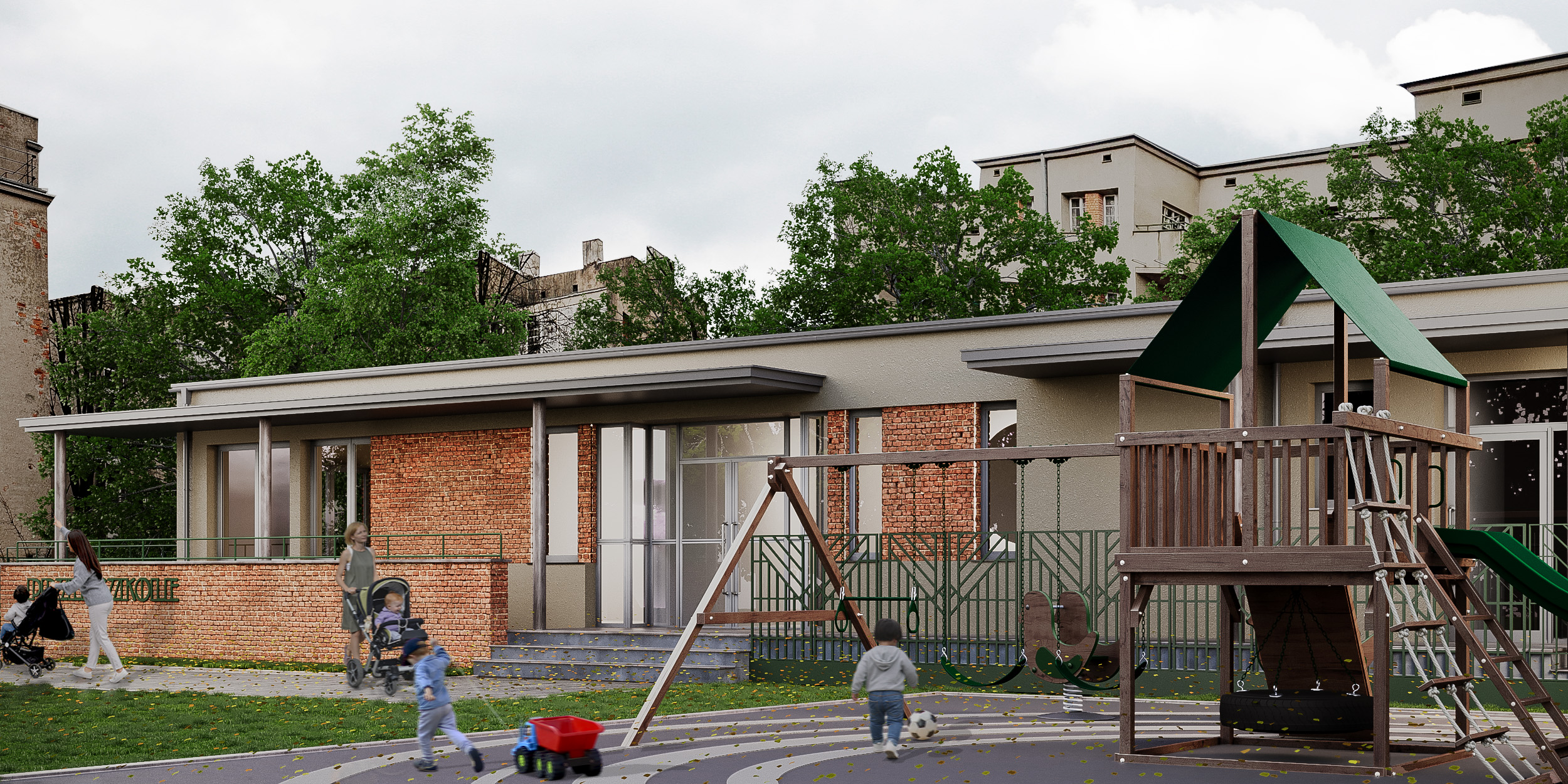 Przedszkole znajduje się na terenie modernistycznego osiedla Montwiłła- Mireckiego. Jego przebudowa polegała na dostosowaniu obiektu do potrzeb edukacji przedszkolnej oraz dla jego zaplecza. Całość bryły została oczyszczona naleciałości po poprzedniej przemysłowej funkcji budynku. W projekcie podkreślono strefę wejściową zadaszeniem na lekkich słupach nawiązującym do wczesnego modernizmu.